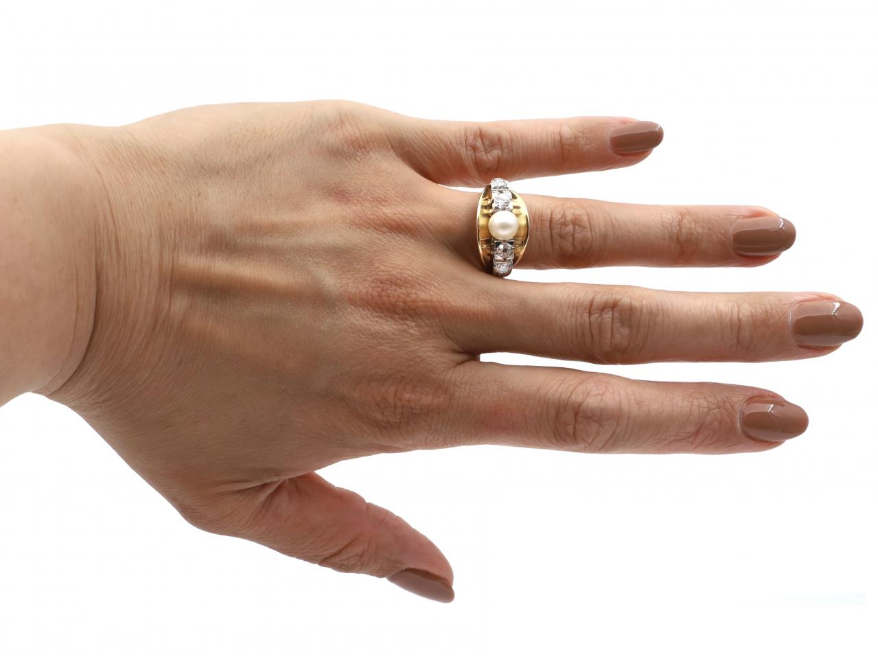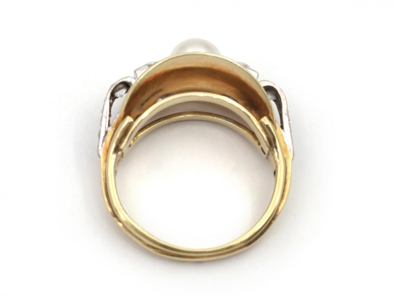1940s pearl and diamond cocktail ring in 14kt yellow gold. Centrally set with a saltwater cultured pearl, flanked to either side with round European cut diamonds in square collet settings in platinum, to a concave retro design with open structured gallery and raised curling shoulders which taper to a solid shank. Marked 14kt gold.