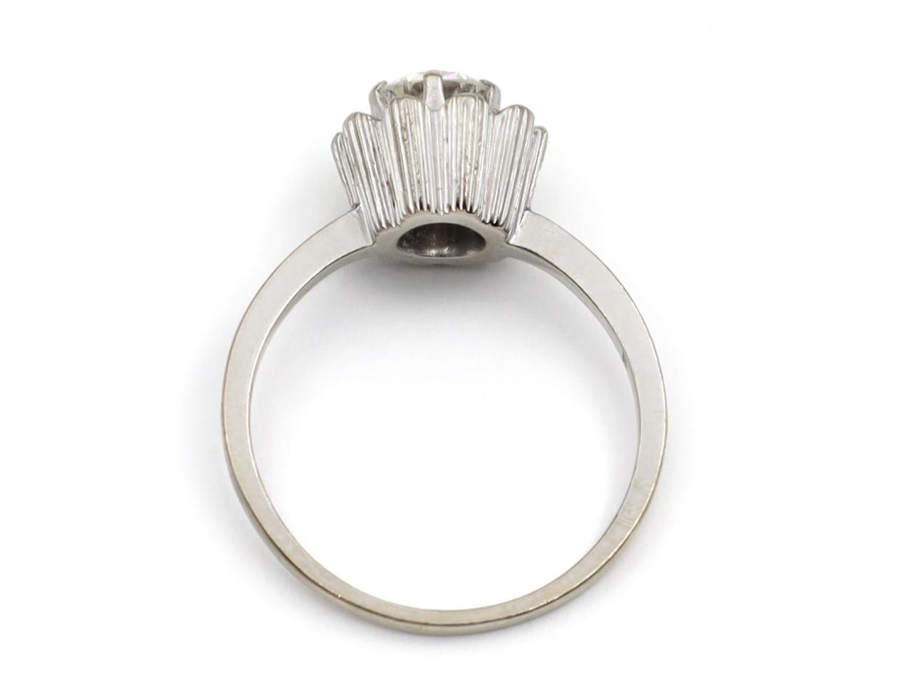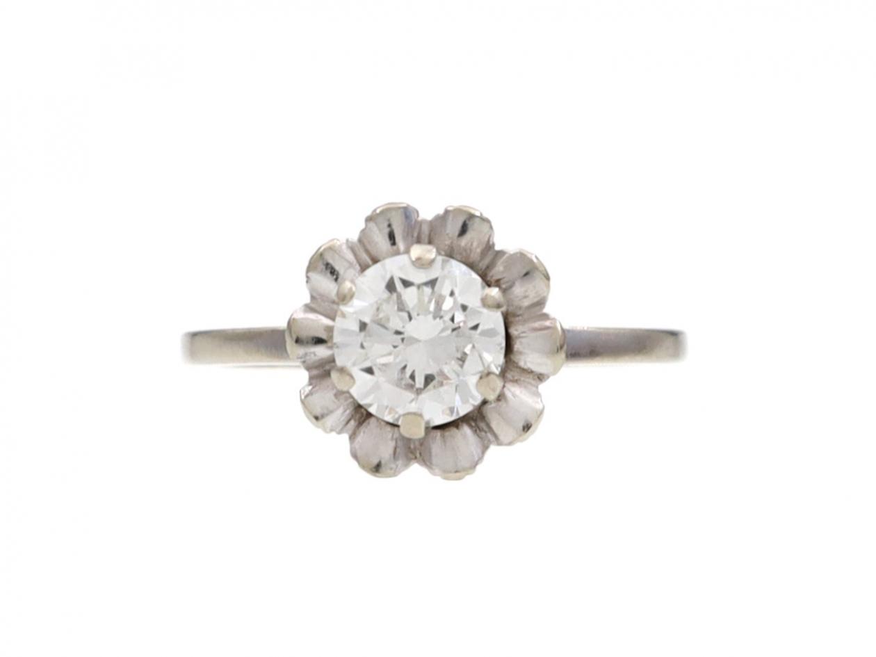 1950s 0.55ct round Old European cut diamond solitaire ring in 18kt white gold. Set with a 0.55ct round Old European cut diamond in a raised scalloped and fluted claw set collet, decorated to the outer with fine linear engravings and flanked by smooth shoulders which continue to a slim shank. Marked 18kt gold.