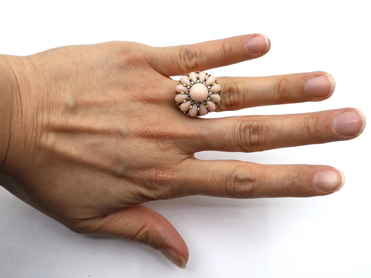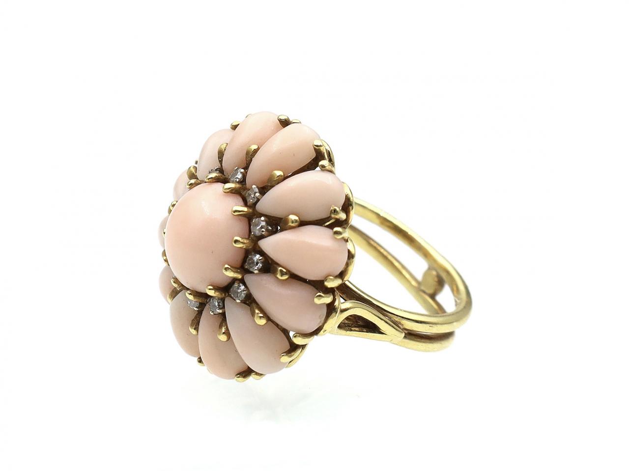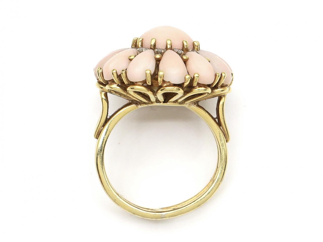 1960s angel skin coral and diamond floral cluster ring in 18kt yellow gold.