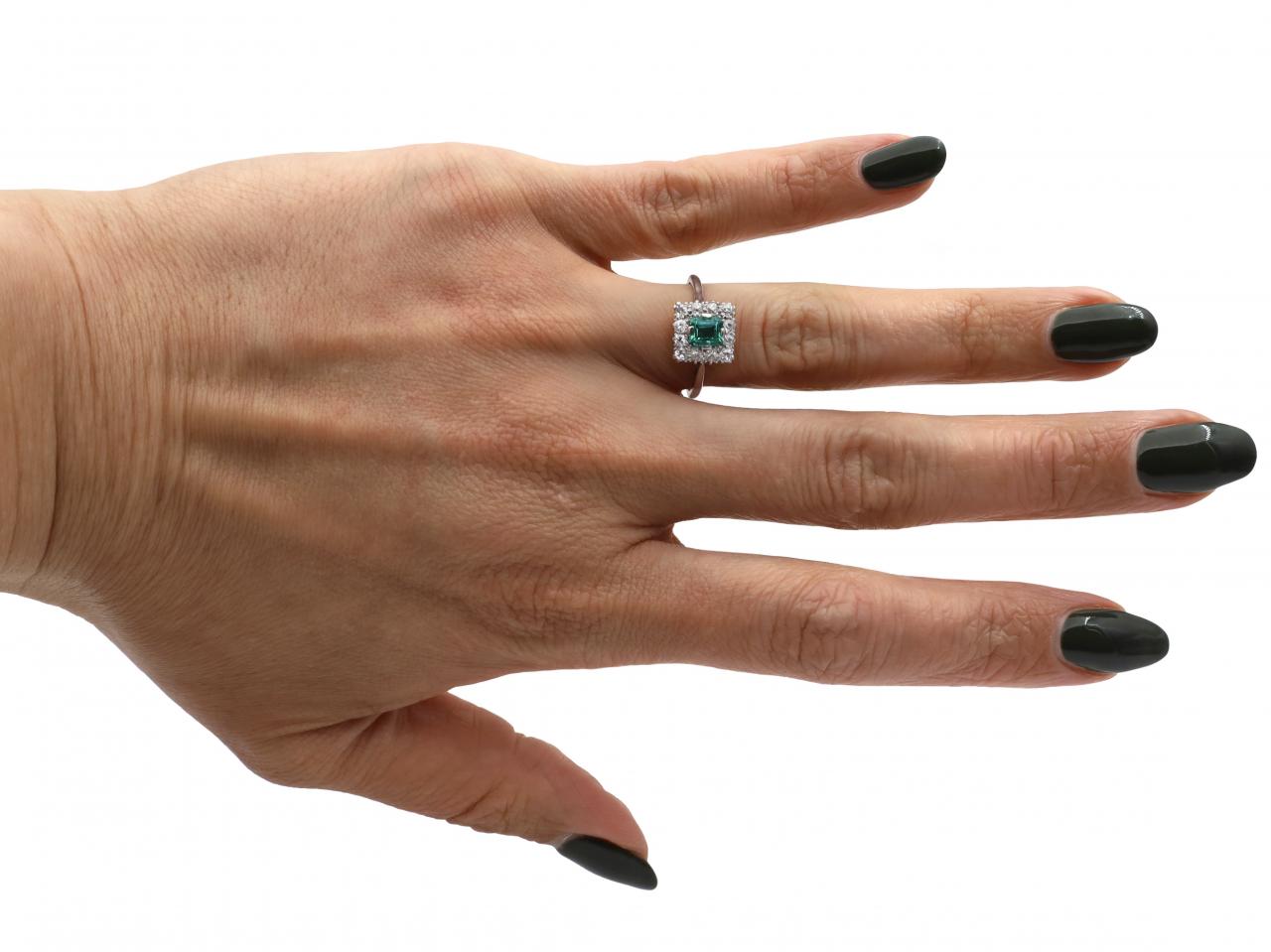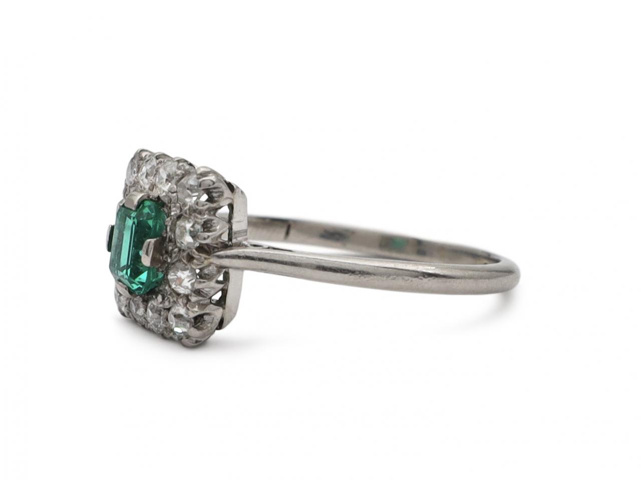1950s Colombian emerald and diamond square cluster ring in platinum. Set with an octagonal emerald cut Colombian emerald in a compass setting, bordered by twelve old cut diamonds in grain and claw settings, to a square cluster design with curving claws and pierced gallery, flanked to either side with raised inwardly tapering shoulders supported by cheniers and smoothing to a solid shank.