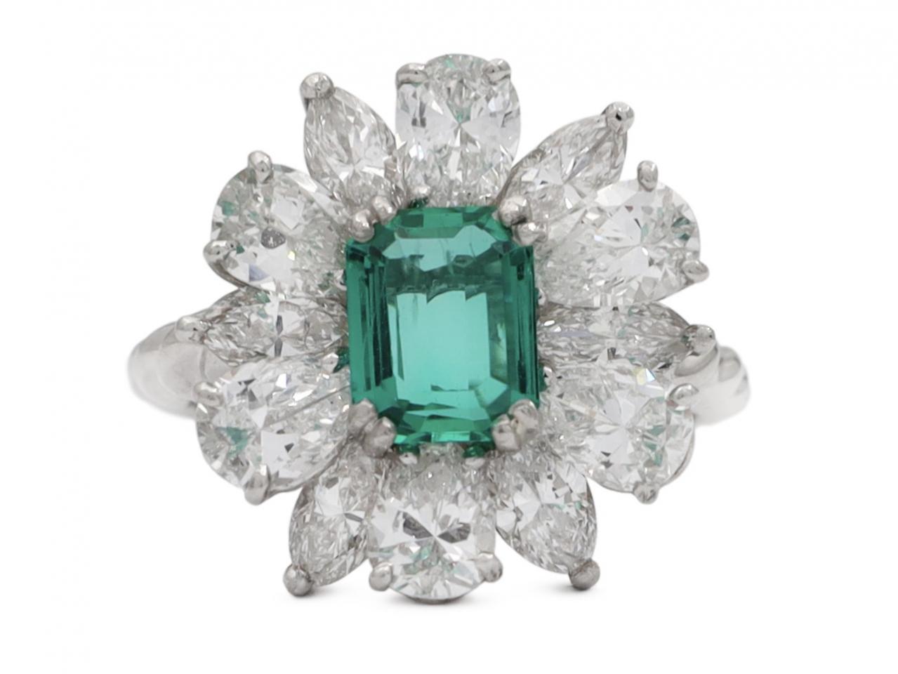1950s emerald and diamond fancy cluster ring in platinum.