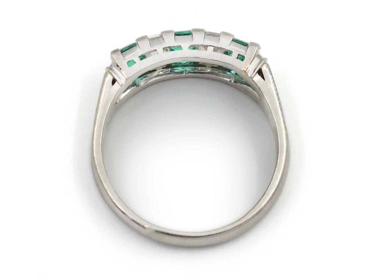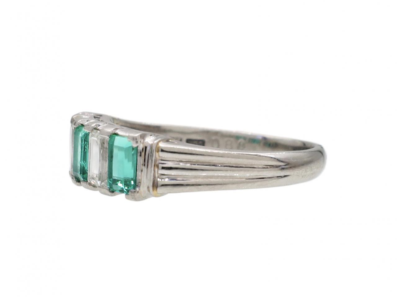 1950s emerald and diamond five stone ring in platinum. Set across the finger with three rectangular emerald cut emeralds in claw settings, alternating with two rectangular emerald cut diamonds in claw settings, to a five stone design with structured claws, finely pierced gallery and ribbed trumpeting shoulders which smooth to a solid shank. Estimated total emerald weight 1.10cts. Estimated total diamond weight 0.80cts. Marked platinum.