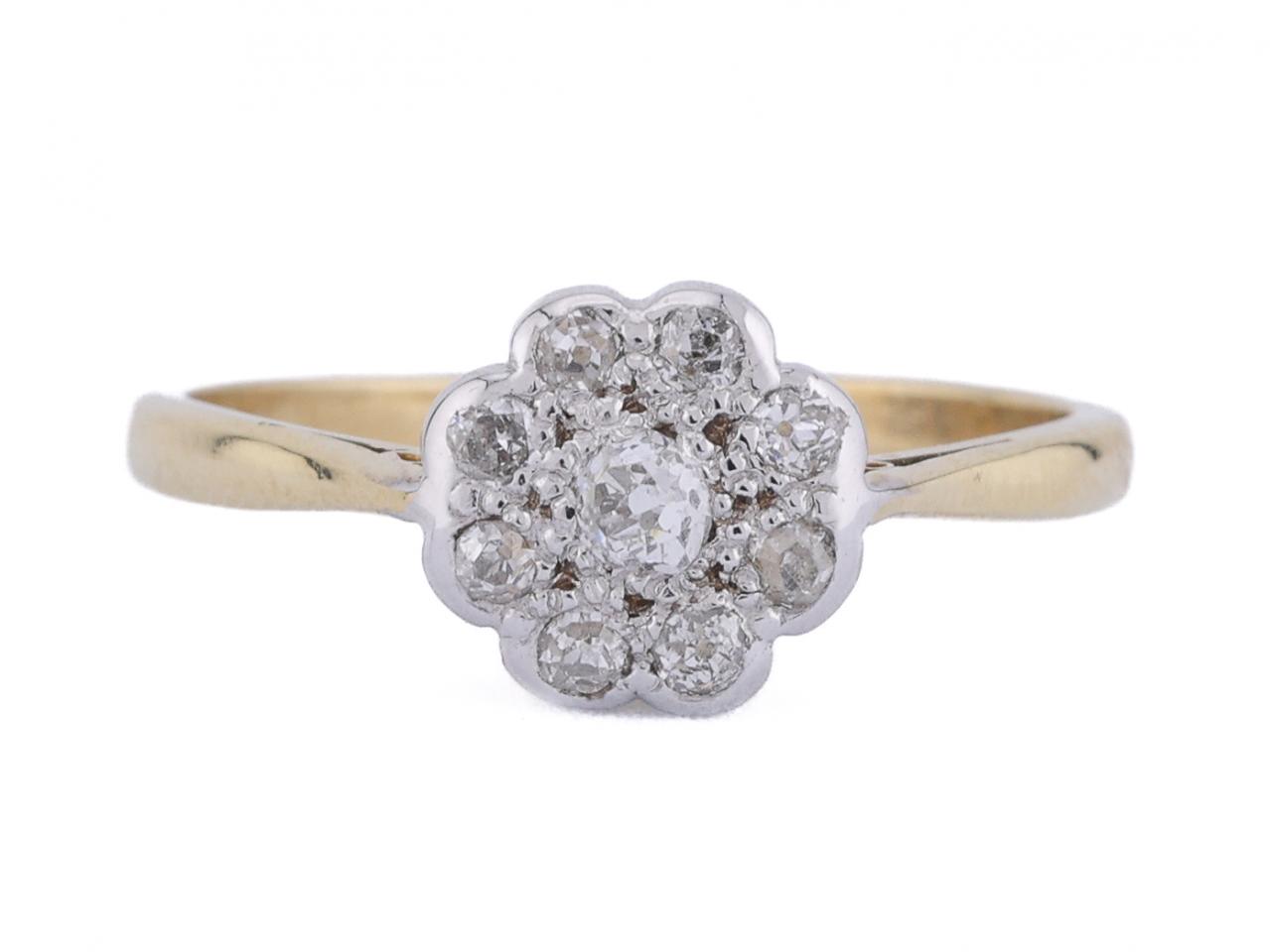 1950s diamond floral cluster ring in platinum and 18kt yellow gold. Set with nine Old Mine cut diamonds in platinum millegrain settings, to a daisy cluster design with scalloped edges, pierced gallery and inwardly tapering shoulders which smooth to a solid shank. Marked 18kt.