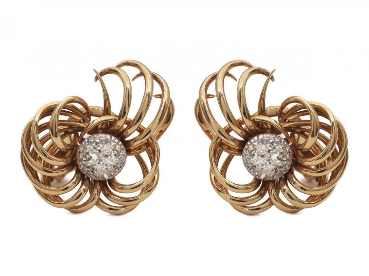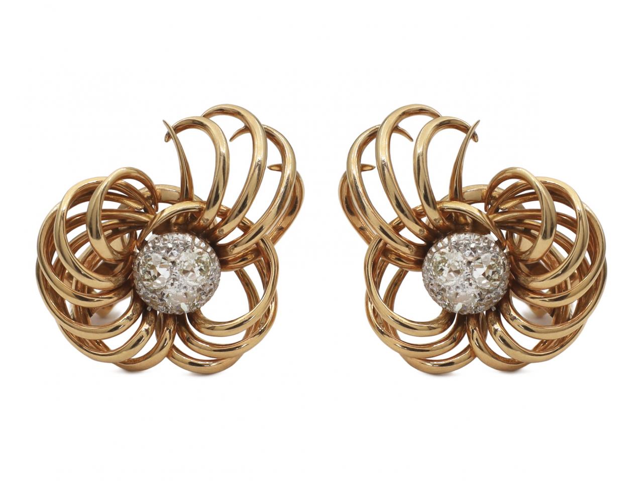 1950s Old Mine diamond wirework floral earrings in 18kt yellow gold. A matching pair of earrings, each centred with three cushion shape Old Mine cut diamonds in grain settings, further enhanced by three round eight cut diamonds in grain settings, to a circular dome surrounded by gold wirework in the form of a stylised flower, fitted to the reverse with a secure post and hinged omega backing. Estimated total diamond weight 1.70cts. Marked 18kt gold.