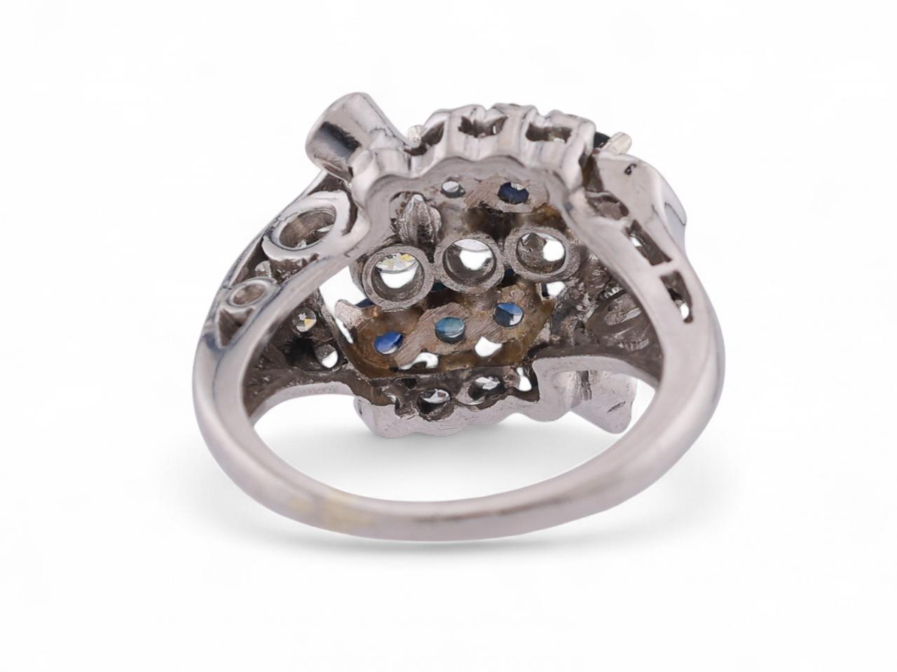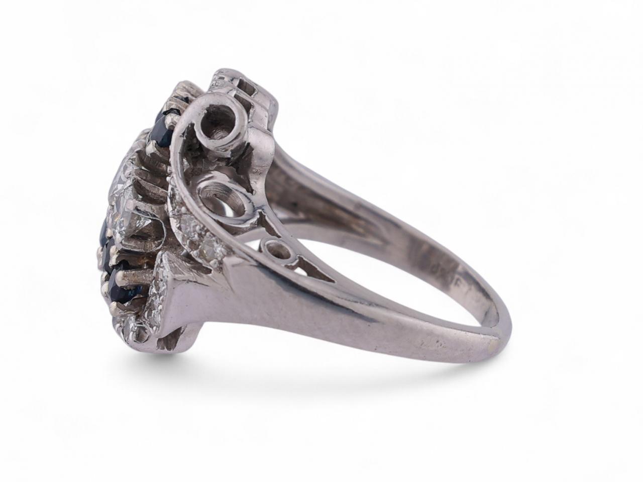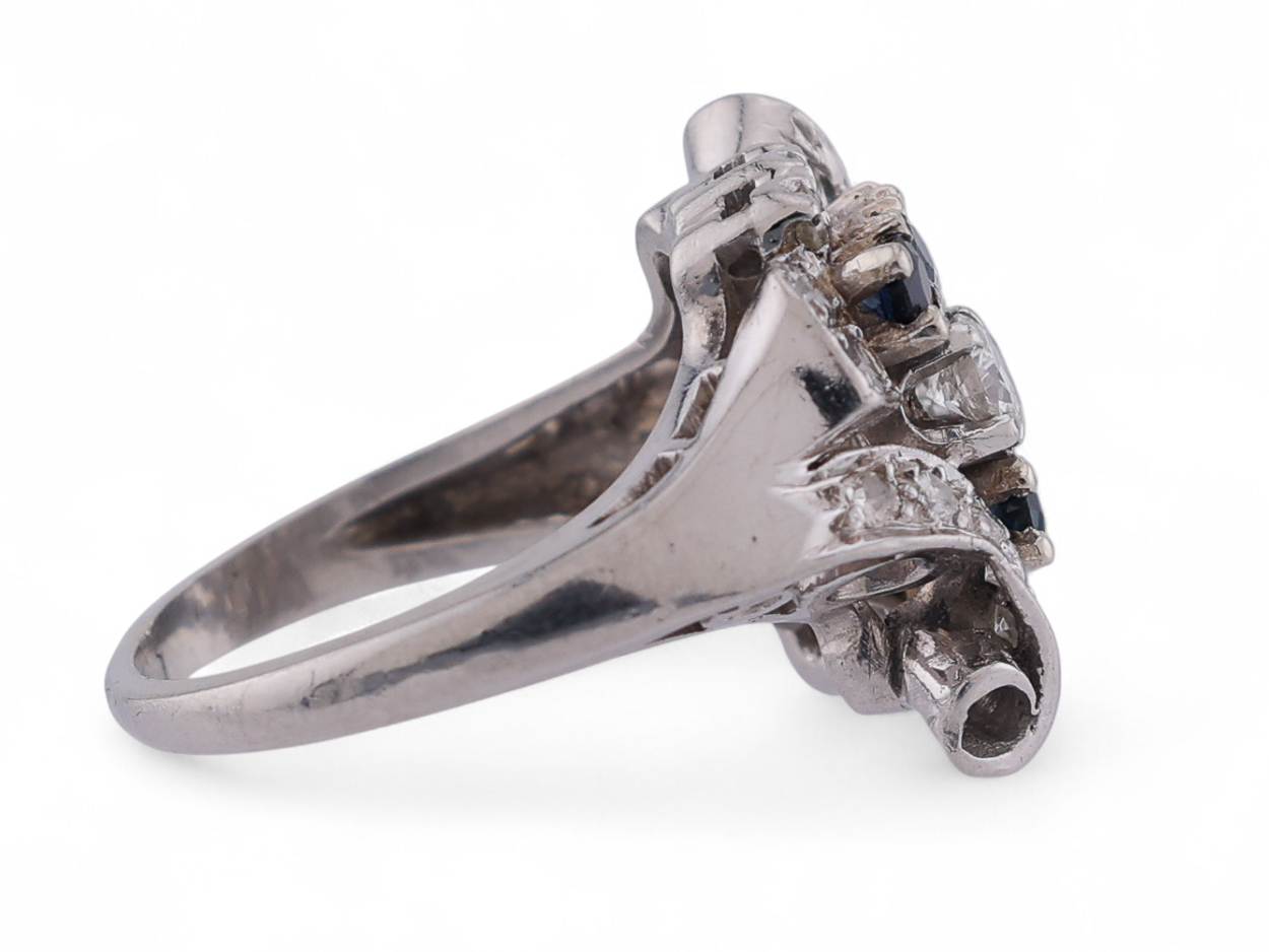 1950s sapphire and diamond fancy cocktail ring in platinum. Centred with three round transitional cut diamonds in a claw settings and six round mixed sapphires set top to bottom in claw settings, to a three dimensional fluted cocktail design framed with eight cut diamonds and fitted to either side with wide integrated shoulders that terminates to a solid shank. Marked platinum and Iridium.