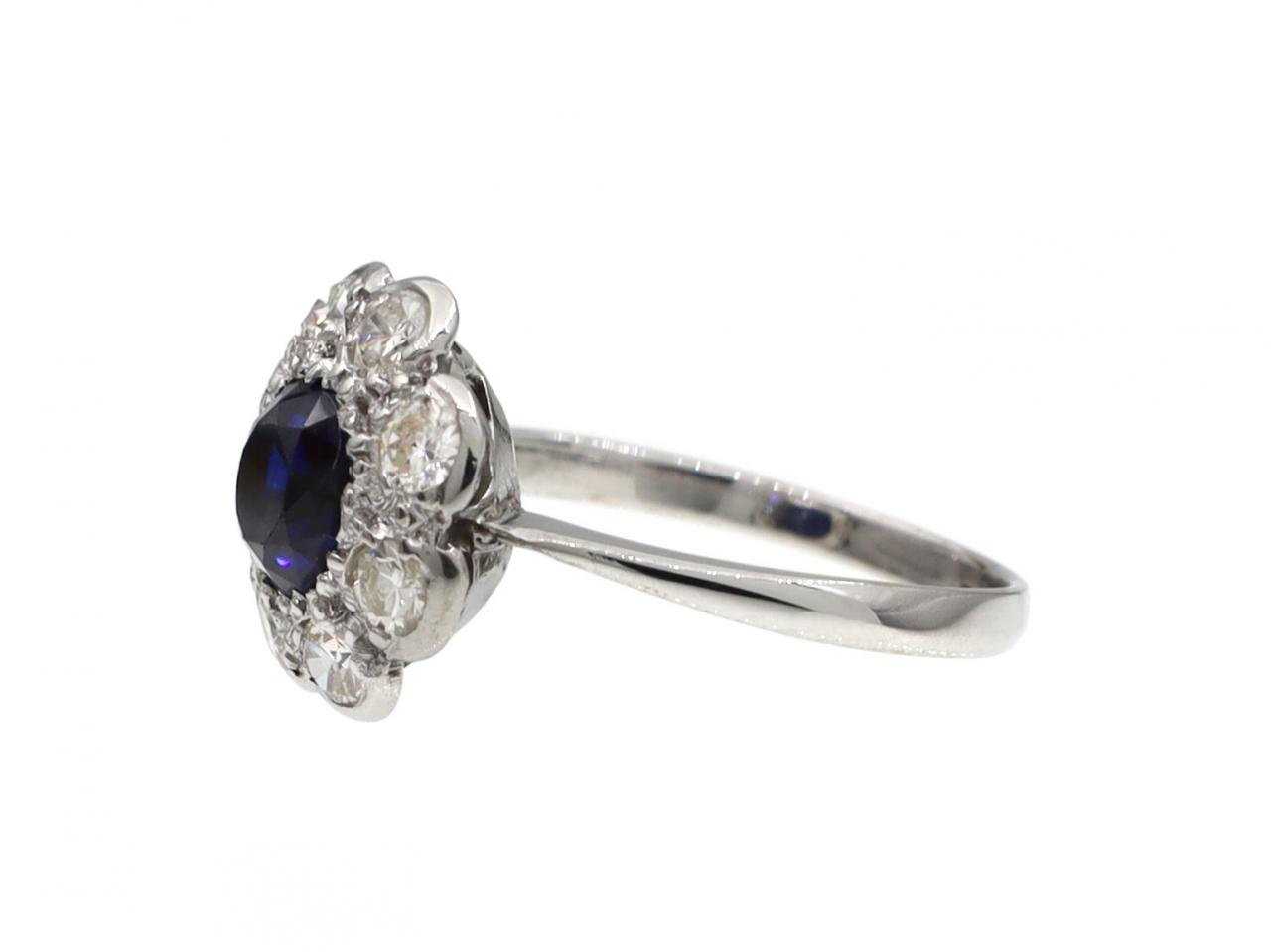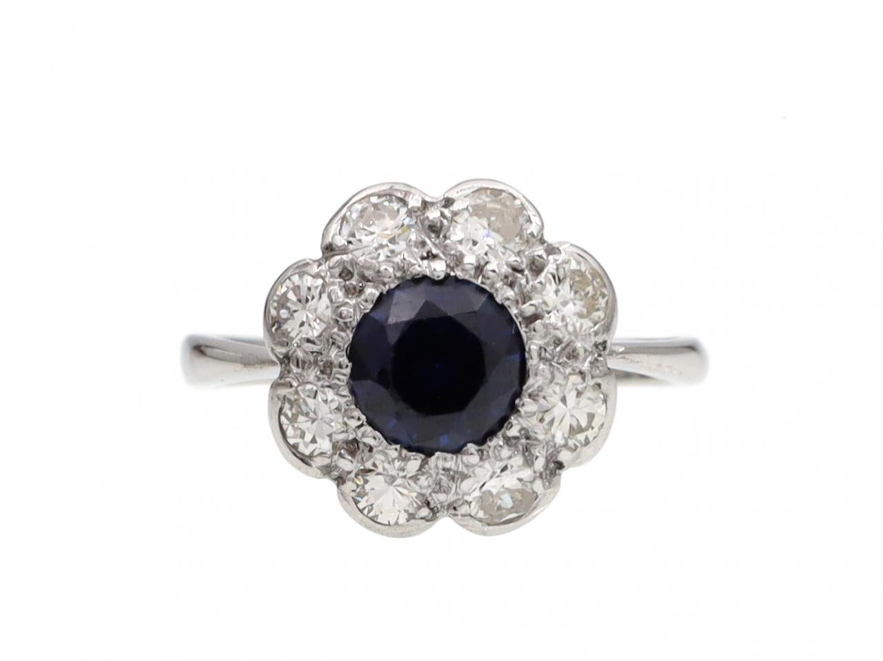 1950s sapphire and diamond floral cluster engagement ring in 18kt white gold. Centrally set with an estimated 0.80ct round mixed cut sapphire in a grain setting, encircled by a row of round old cut diamonds in grain and rubover settings, to an elegant cluster design with scalloped edges, openwork decorative gallery and met to either side with raised inwardly tapering shoulders which smooth to a solid shank. Estimated total diamond 0.70cts in weight. Marked 18kt gold.