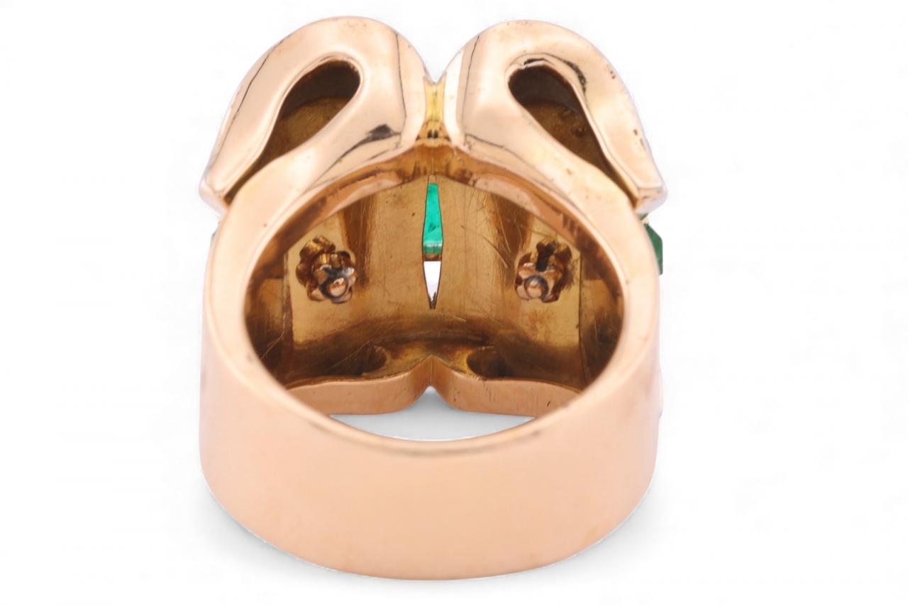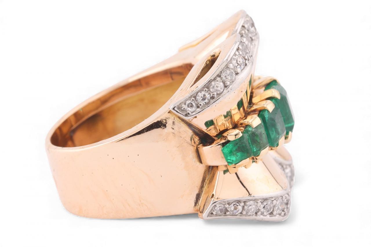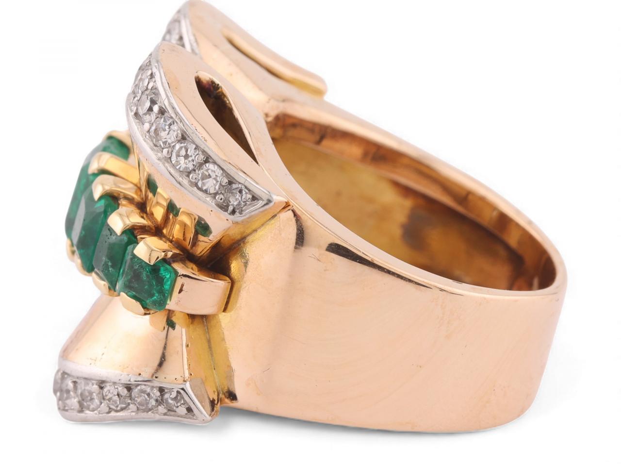 A striking 1950s cocktail ring crafted in 18kt yellow gold with a distinctive fluted profile. The centre is set with seven vibrant emeralds arranged in a horizontal row, secured by stepped yellow gold claws that enhance the strong mid-century geometry. Round diamonds frame the top and base of the ring, adding brightness and definition. The combination of bold gold work and vivid emeralds gives this ring real presence. A standout example of post-war design.