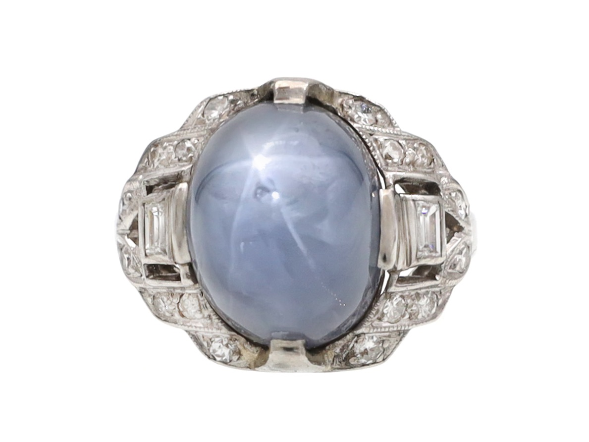 1950s star sapphire and diamond cluster ring in platinum. Centred with an oval cabochon cut star sapphire in a claw setting, surrounded and flanked by round eight cut and rectangular baguette cut diamonds in grain and rubover settings, to a stylised cluster design with bespoke settings, openwork gallery and slightly trumpeting shoulders which smooth to a solid shank.
