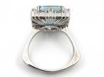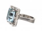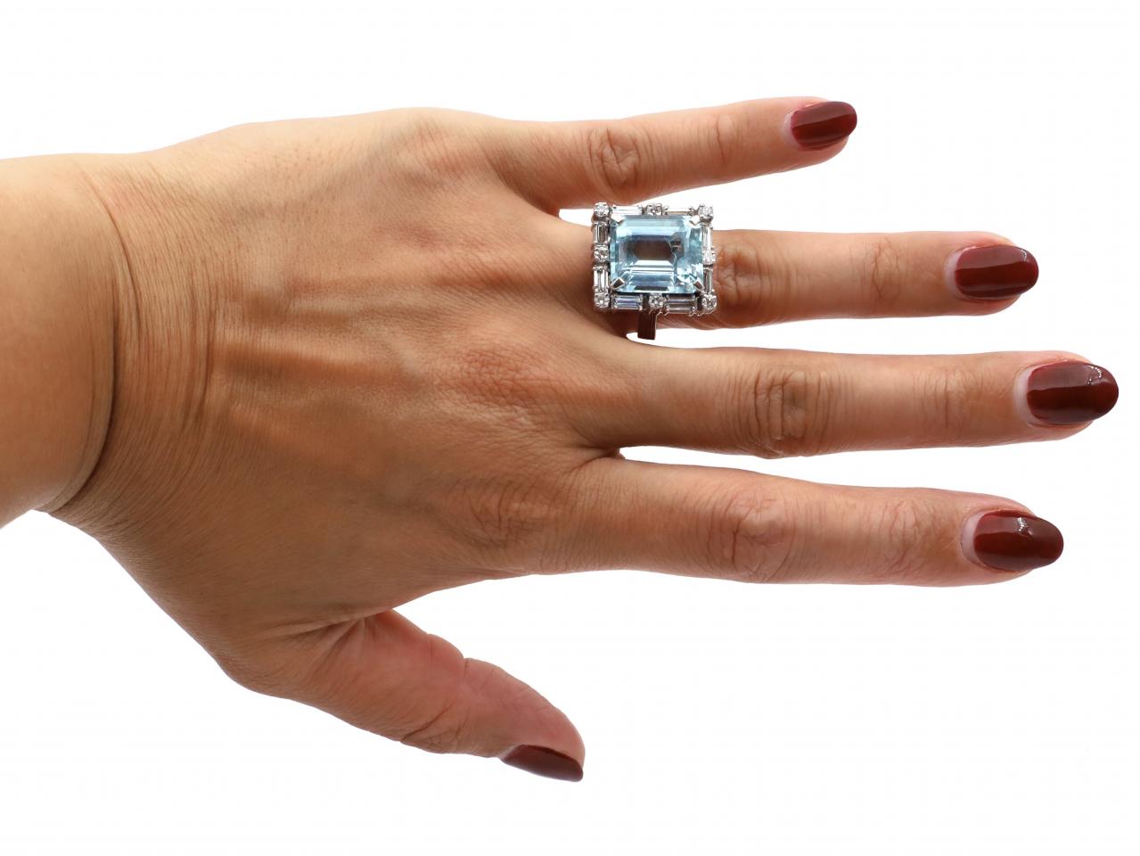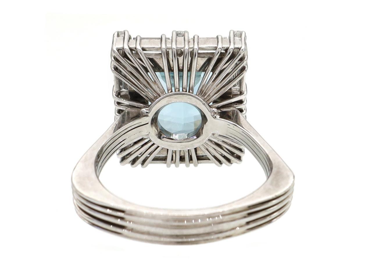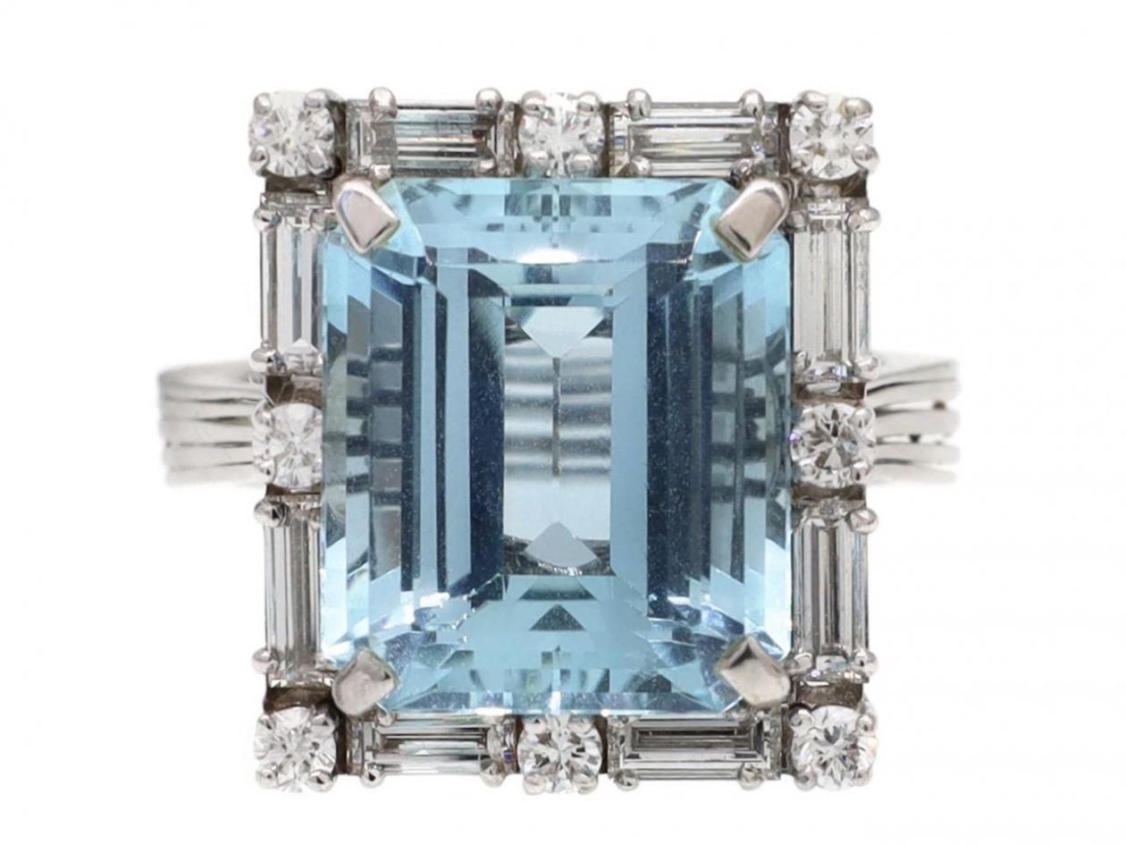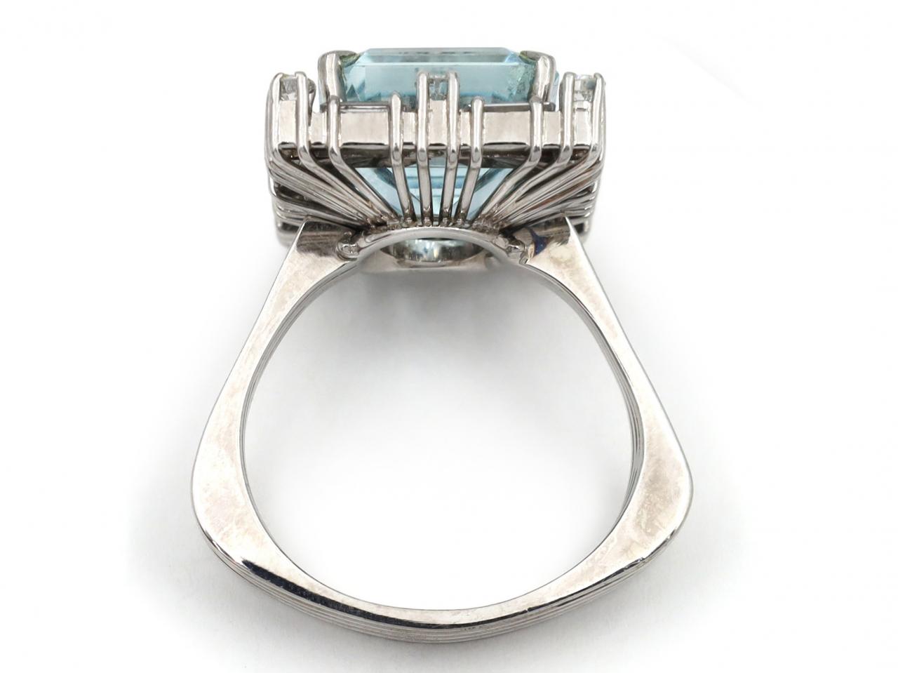 1960s aquamarine and diamond cocktail ring in 18kt white gold. Centrally set with an estimated 12.00ct octangonal emerald cut aquamarine in a slightly raised four claw setting, bordered by alternating round brilliant and rectangular baguette cut diamonds in claw settings, to an impressive cluster design with stylised claws, open radiating linear gallery and flanked by raised split shoulders which continue to an angular shank with openwork detail.
