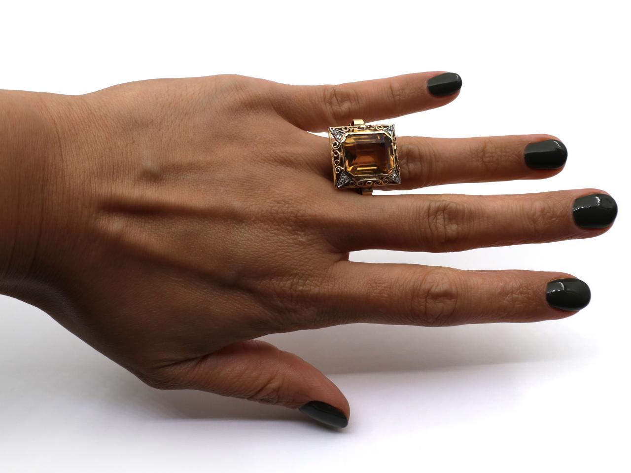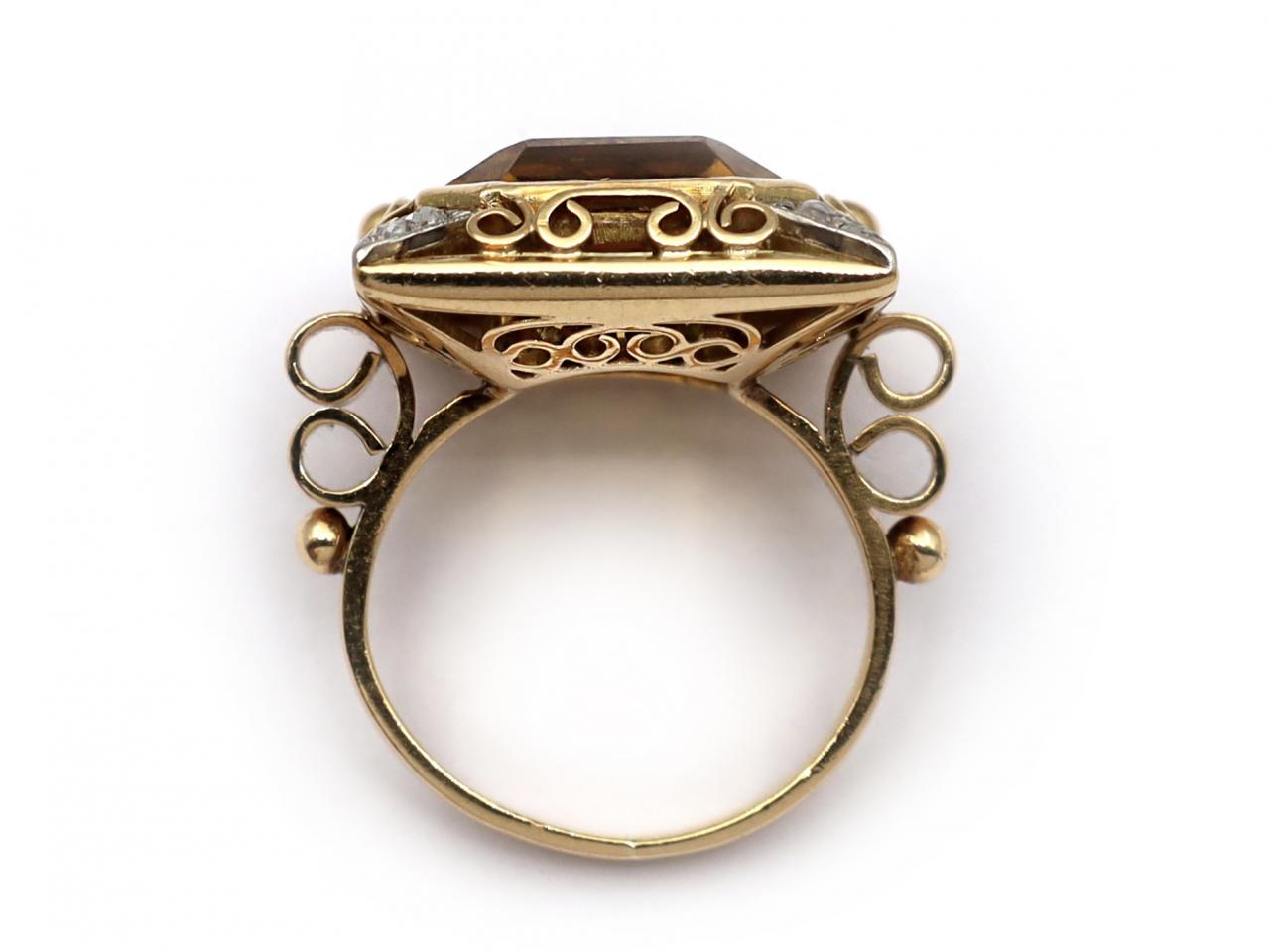 1960s citrine and diamond cocktail ring in 18kt yellow gold. Centred with a 9.40ct octagonal emerald cut citrine in a rubover setting, framed with an openwork border with scrolling motifs and diamond set corners, supported by a decorative pierced open gallery and flanked by raised elaborate scrolling shoulders with spherical terminals leading to a solid shank. Marked 18kt gold.