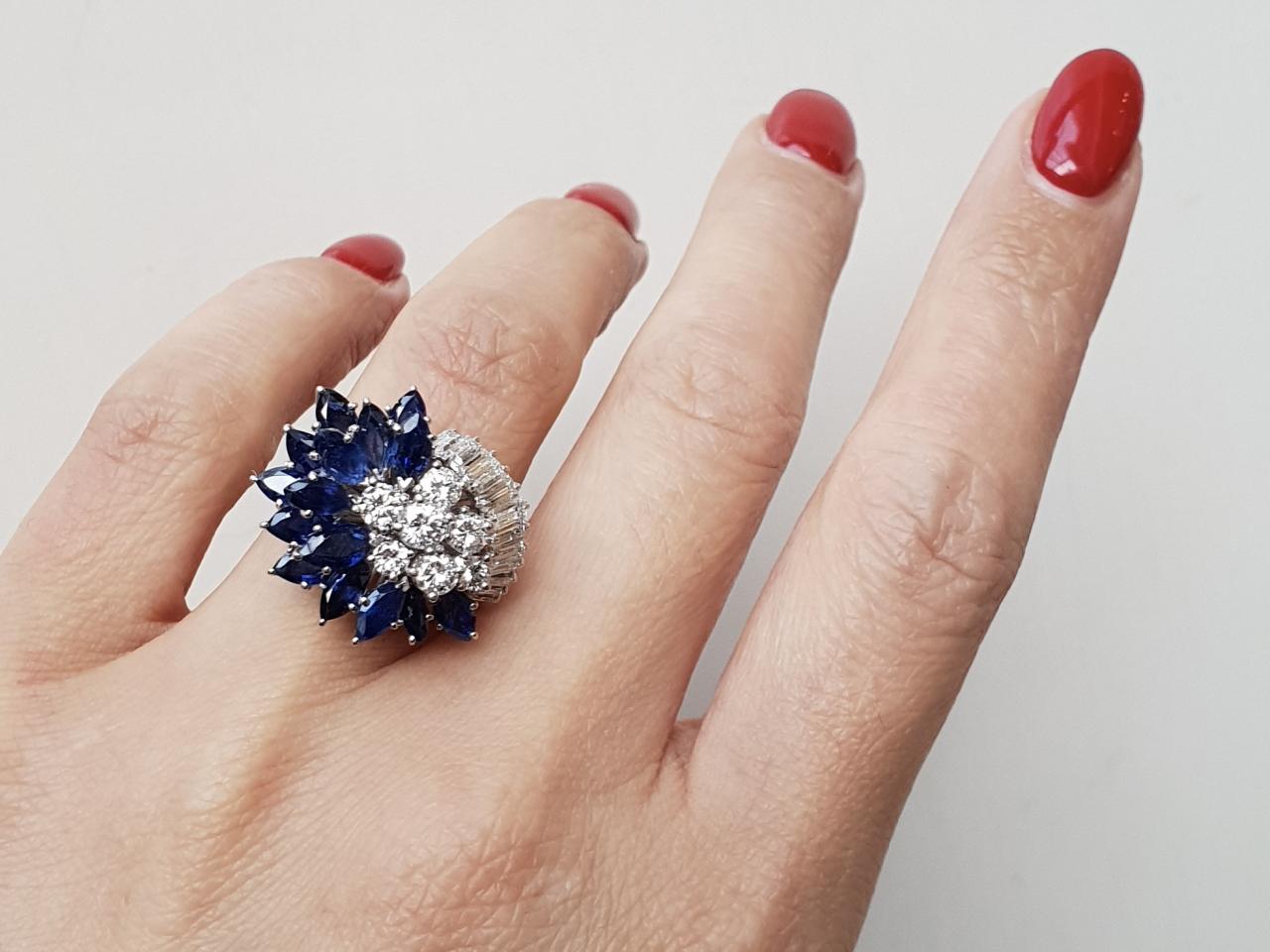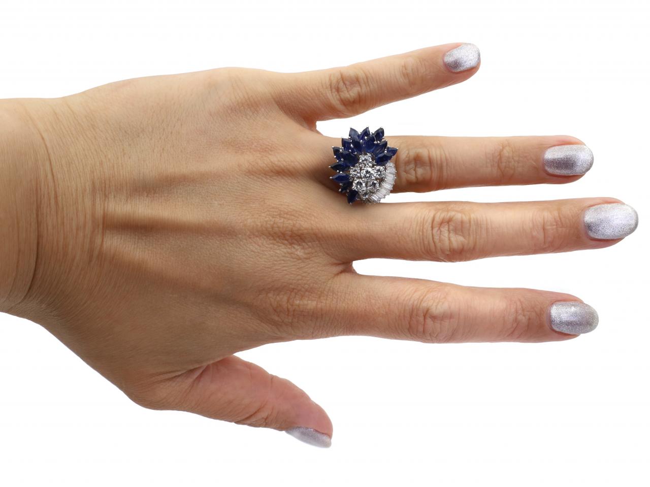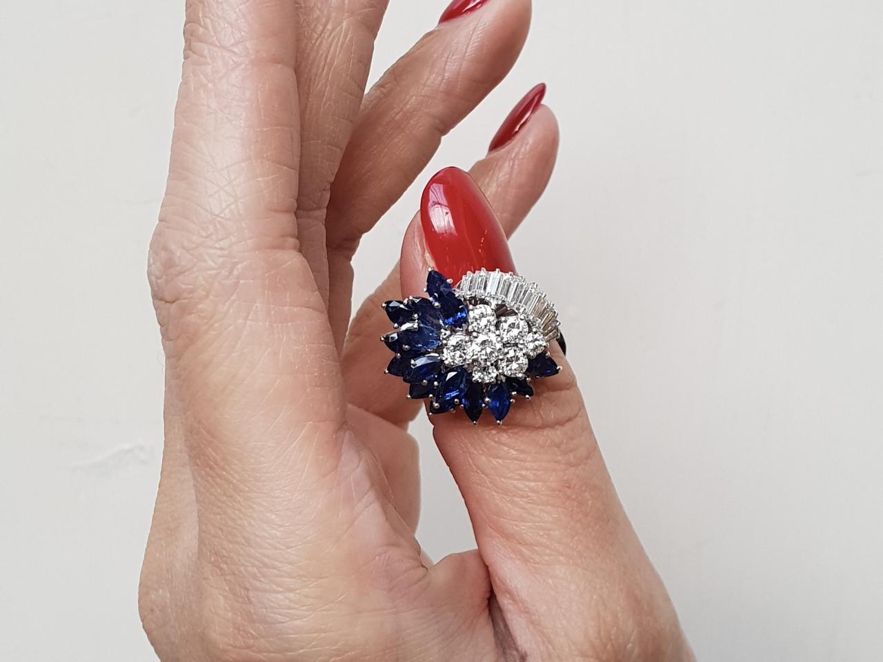 1960s diamond and marquise sapphire fancy cluster ring in 18kt white gold. Centrally set with seven round brilliant cut diamonds in staggered four claw settings, decorated with fifteen marquise brilliant cut sapphires in flared claw settings, further embellished to the top with rectangular baguette cut diamonds in claw settings. Estimated total diamond weight 1.35cts. Estimated total sapphire weight 3.00cts.