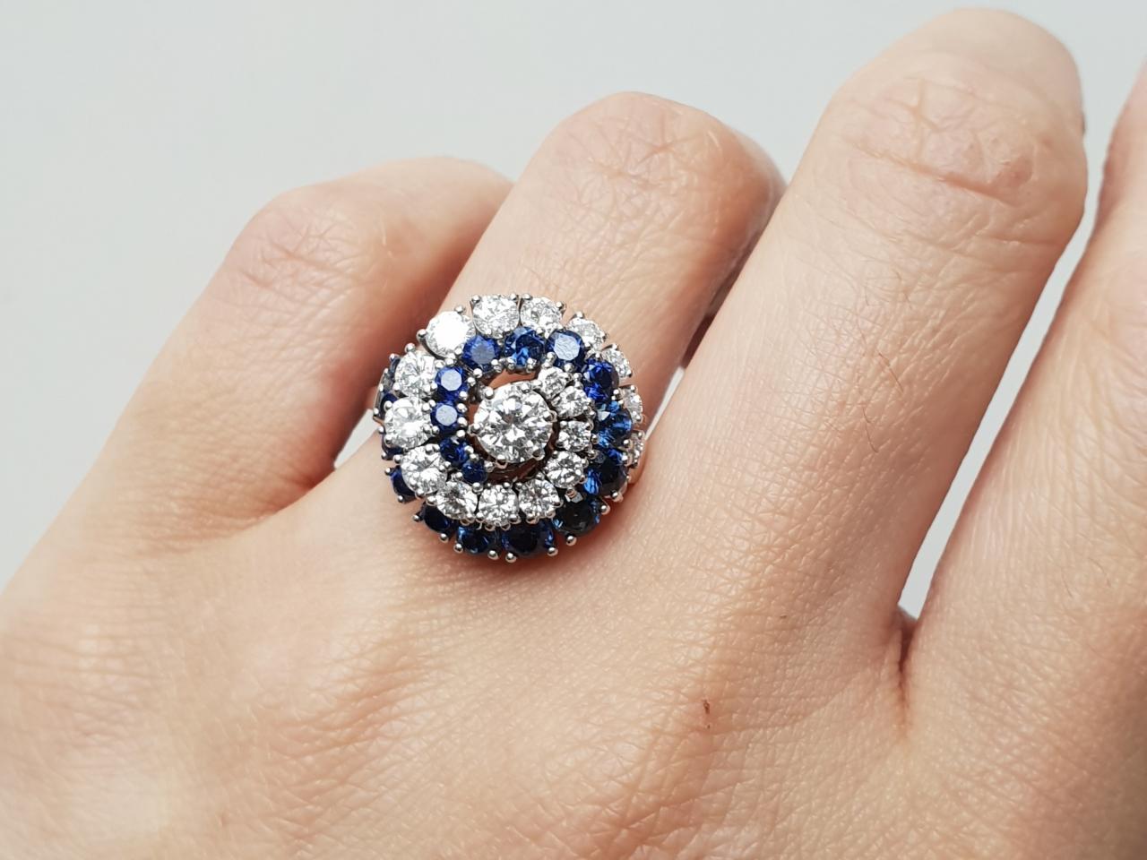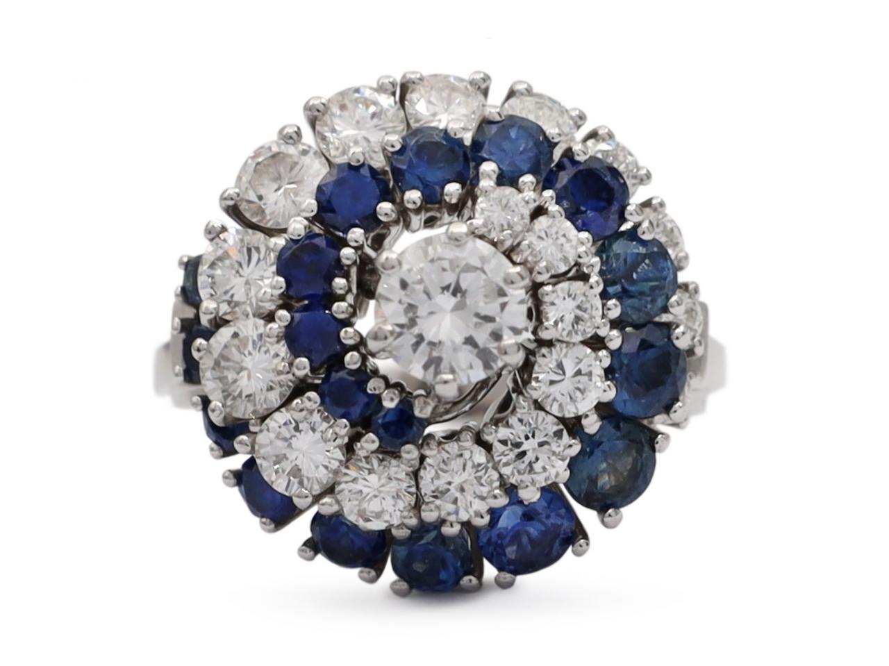 1960s diamond and sapphire screw cluster ring in 18kt white gold. Centred with a round brilliant cut diamond in a raised claw setting, set with eighteen round brilliant cut diamonds and eighteen round mixed cut sapphires, to a swirling vertical design with alternating spirals, curving claws, structured gallery and raised trumpeting shoulders with stepped shank with a centre in high relief. Estimated total diamond weight 1.33cts. Estimated total sapphire weight 1.10cts. Marked 18kt gold.