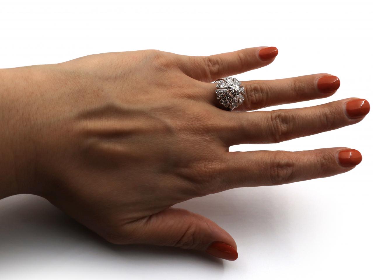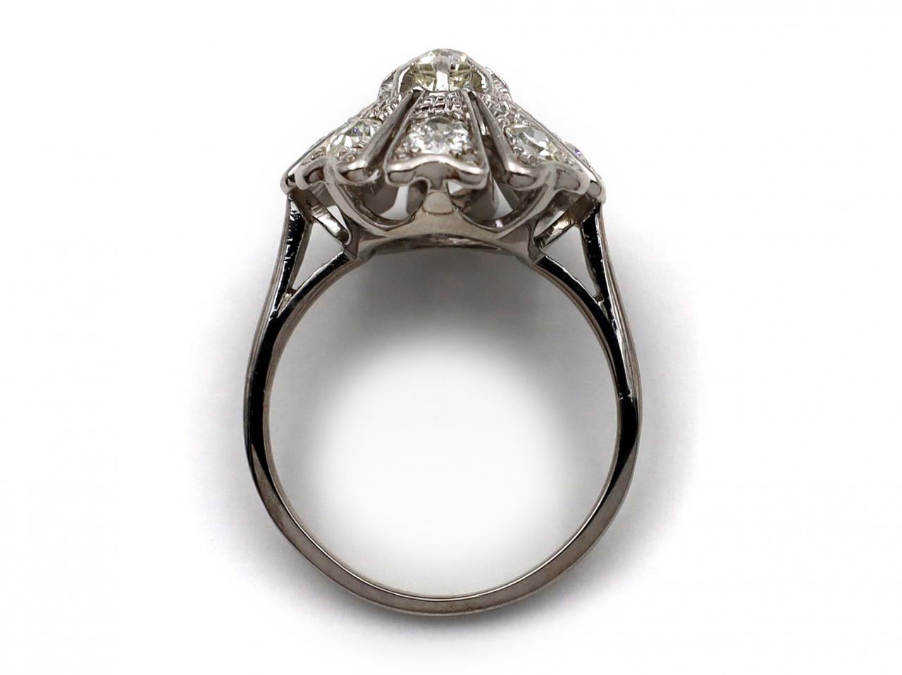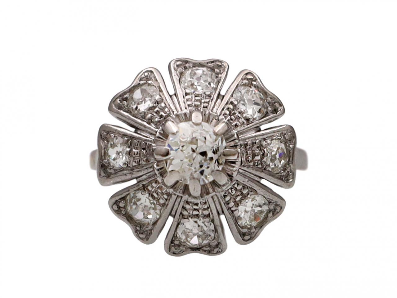 1960s diamond vertical floral cluster ring in platinum. Centrally set with a cushion shape old cut diamond in a raised claw setting, surrounded by tapering petals set with round old cut diamonds in grain settings, to a stylised cluster with millegrain borders and pierced openwork gallery, flanked to either side with raised shoulders which curve to a solid shank.
