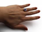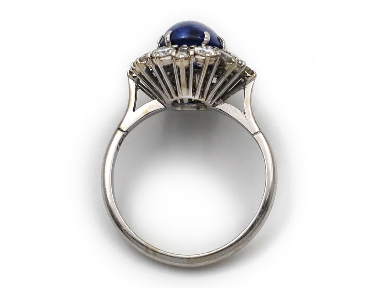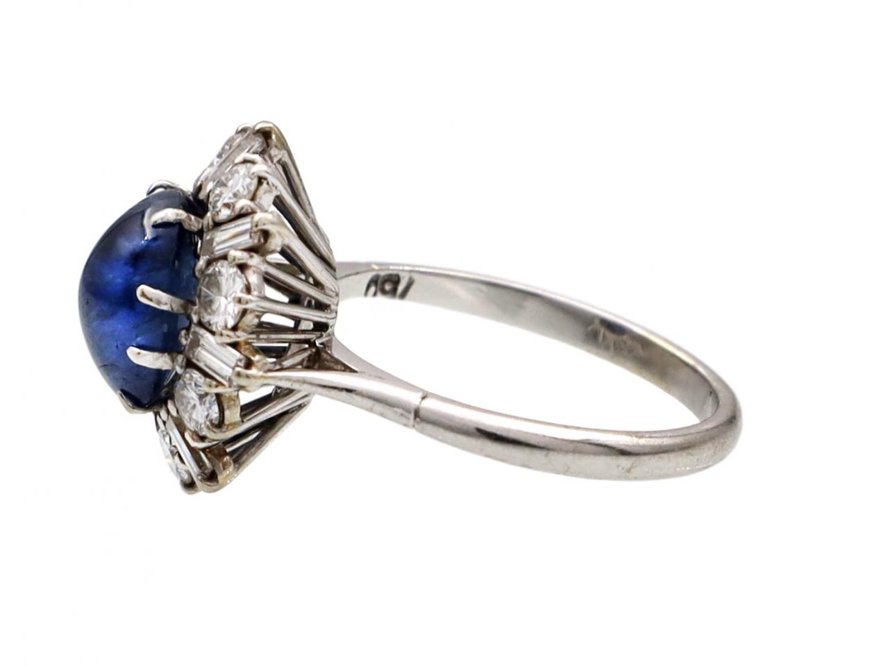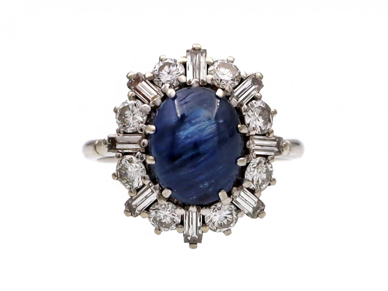 1960s sapphire and diamond vertical cluster ring in 18kt white gold. Set with an oval cabochon cut sapphire in a claw setting, surrounded by alternating round brilliant cut and rectangular baguette cut diamonds in claw settings, to a raised cluster design with curving claws and vertical linear gallery, flanked to either side with raised inwardly tapering shoulders which smooth to a slim shank.