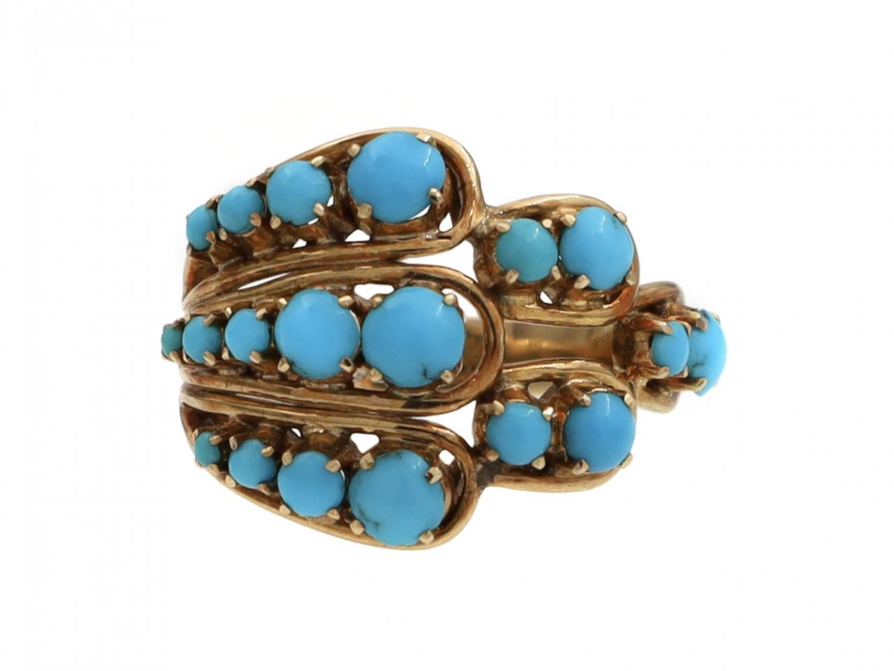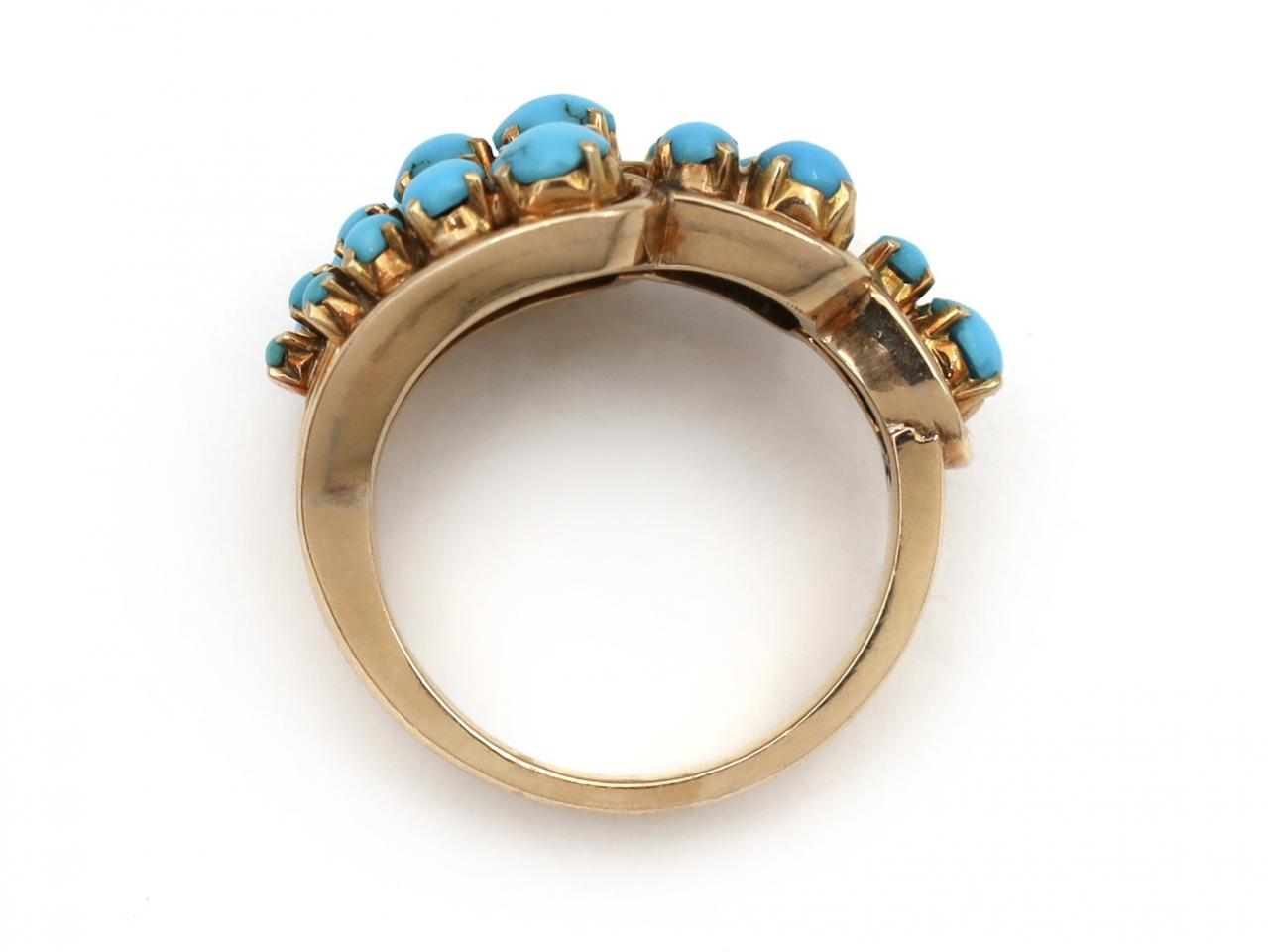 1960s turquoise open spray ring in 14kt yellow gold. A tiered spray design featuring three rows of thirteen round cabochon cut turquoise in graduating claw settings, further set with two rows of four round cabochon cut turquoise in claw settings and terminating in one row of two round cabochon cut turquoise in claw settings, to an openwork design with curving claws polished rounded borders and met to either side with a incised three row shank. Tested 14kt gold.
