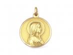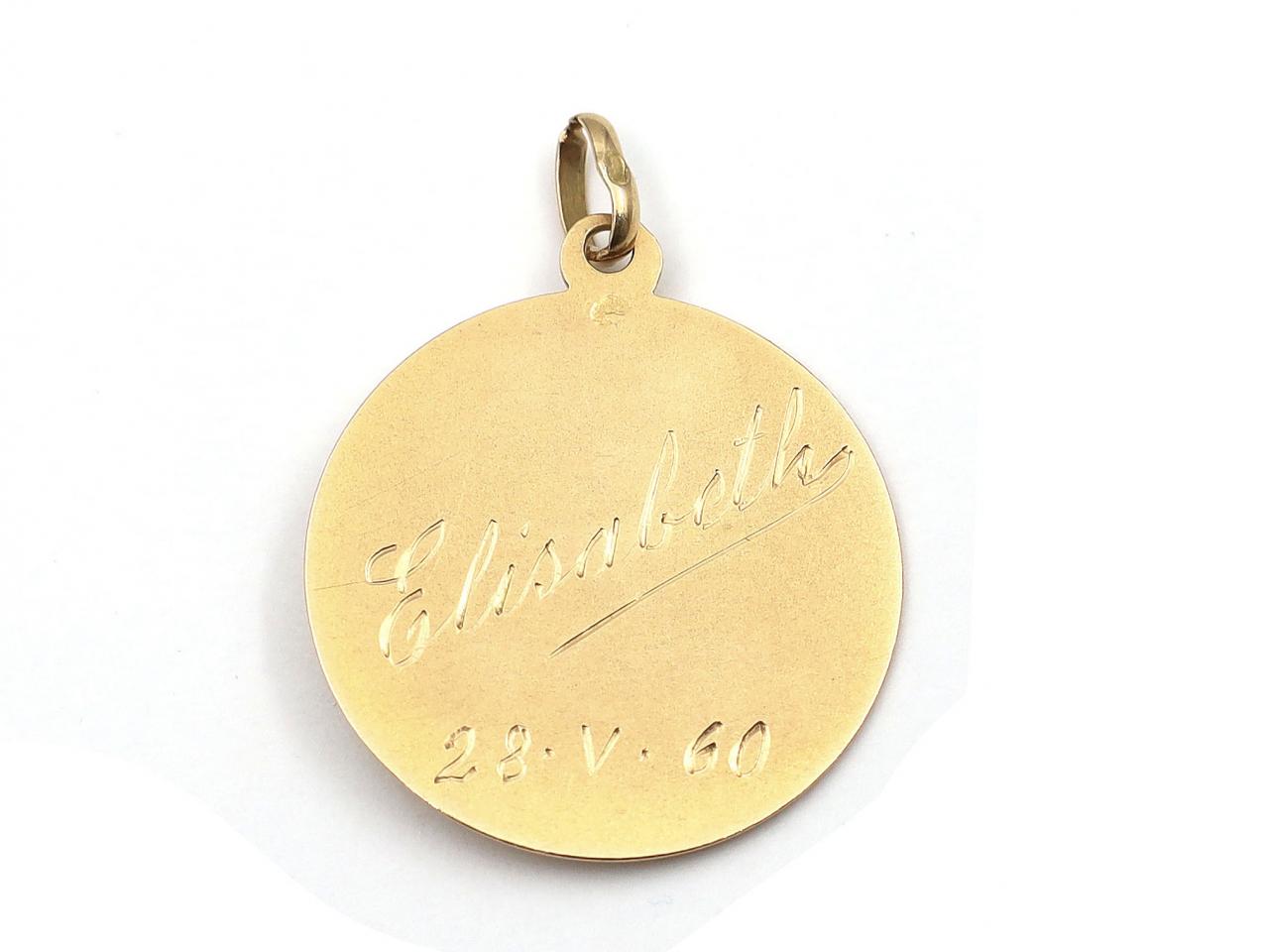 1960s Virgin Mary circular pendant in yellow gold. Engraved to the reverse ' Elizabeth 28.V.60'.