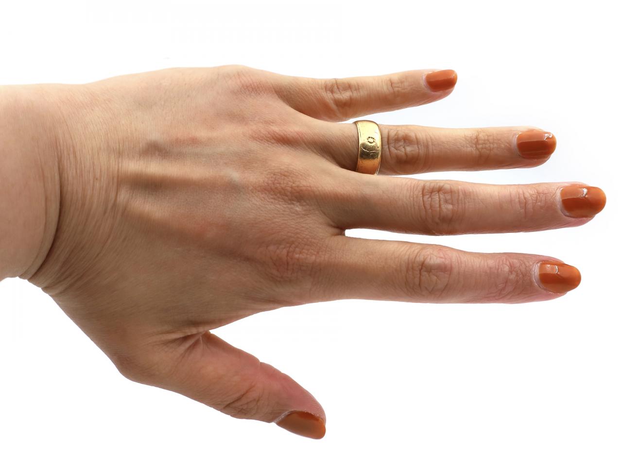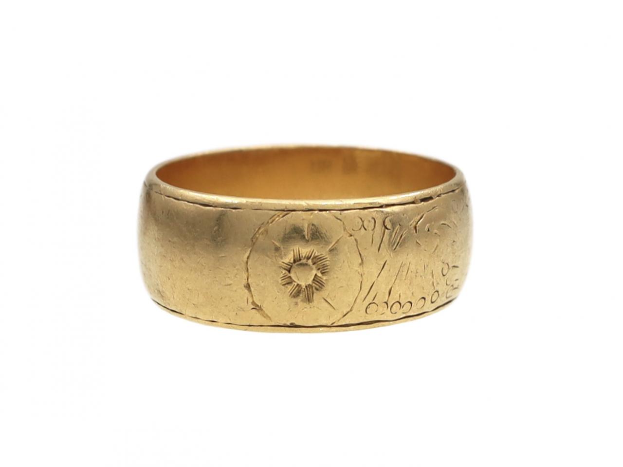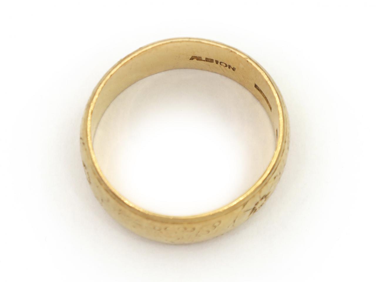 1961 floral engraved 7.5mm wedding ring in 22ct yellow gold. Hallmarked 22ct gold, London, 1961. Makers mark for The Albion Chain Co.