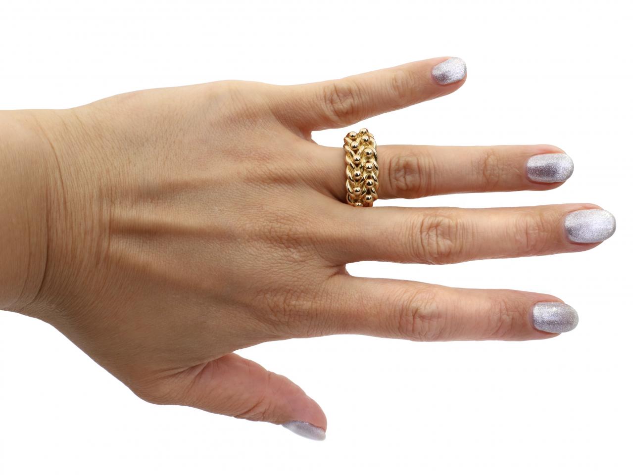 1969 solid keeper ring in 18kt yellow gold. Set to the front with a double braided and granulated motif met to either side with broad incised shoulders which curve to a solid shank. Hallmarked 18kt gold, London, 1969. Maker's mark W.Wilkinson Ltd.