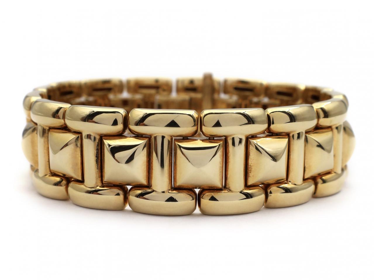 1970s Chaumet pyramid brick link bracelet in 18kt yellow gold. A heavy bracelet consisting of repeating links of polished gate links alternating with rounded three-dimensional pyramid links, terminating to an integrated push clasp mechanism and hidden hinged safety latch. Hallmarked 18kt gold, French. Signed 'CHAUMET PARIS'. Numbered '301654'.