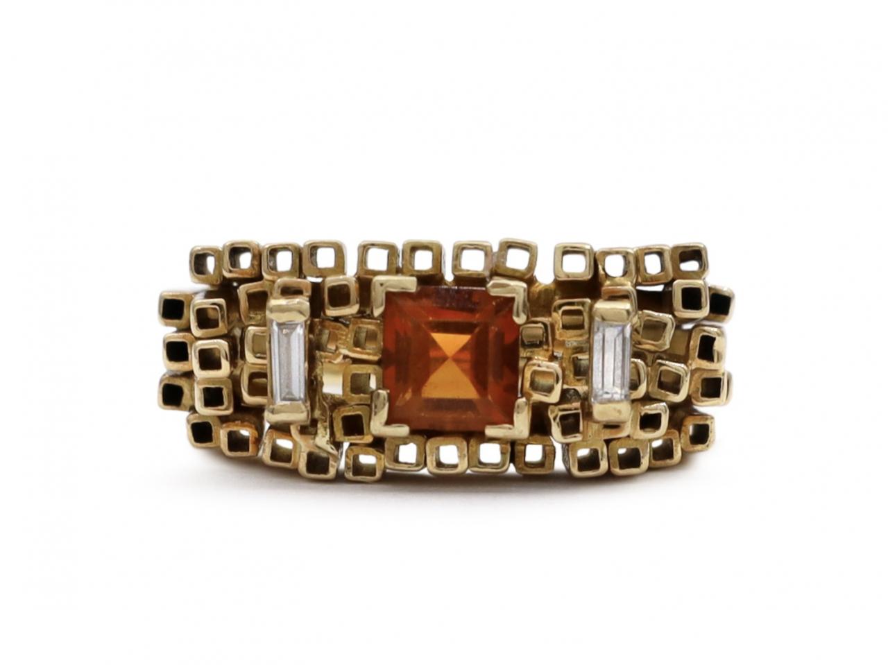 1970s citrine and diamond cubist ring in 18kt yellow gold. Centrally set with a square step cut citrine in a four claw setting, flanked by to rectangular baguette cut diamonds in raised tension settings, to a three-dimensional cubist design featuring squared polished settings, columnar forms throughout which continue to the shoulders and flow to a solid three ribbed shank. Tested 18kt gold.