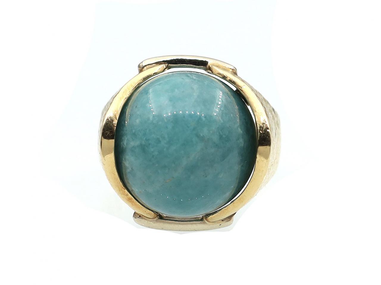 1970s Convertible three sphere ring in 18kt yellow gold. An 18kt yellow gold open ring with raised curved trumpeting shoulders, held together at the side by linear structures and decorated throughout with a florentine effect, this piece is convertible and has three gemstone spheres of onyx, amazonite and rose quartz to interchange.