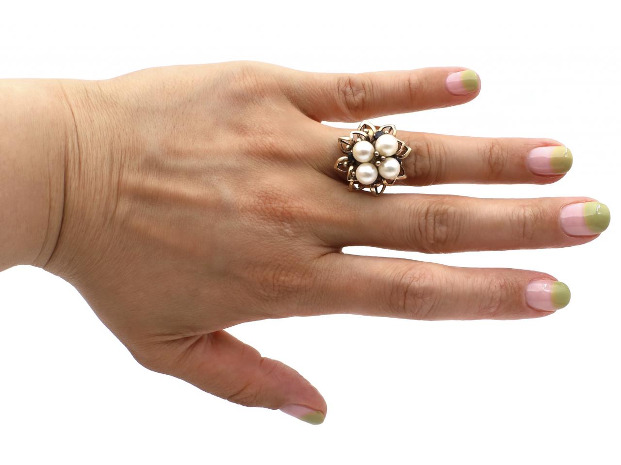 1970s cultured pearl and sapphire vertical floral cluster ring in 9kt yellow gold. Centred with four cultured pearls further embellished with four round mixed cut sapphires in four claw settings, to a raised three tiered openwork floral design with polished granules and linear gallery, fitted beneath with a broad solid shank. Hallmarked 9kt gold, London, 1972.