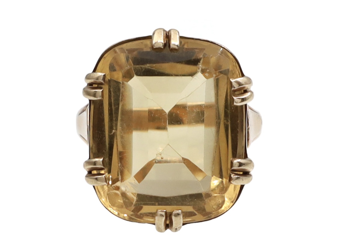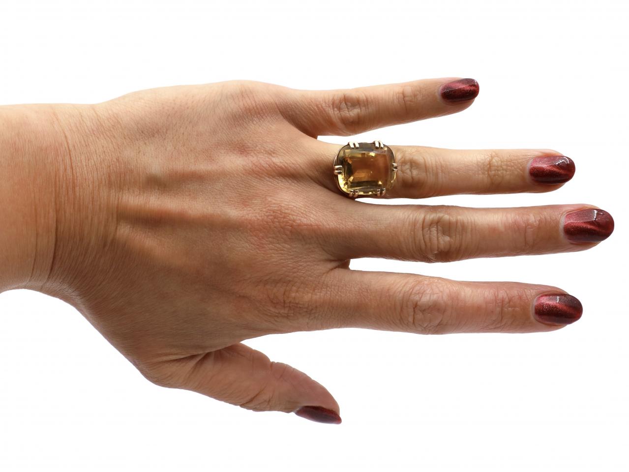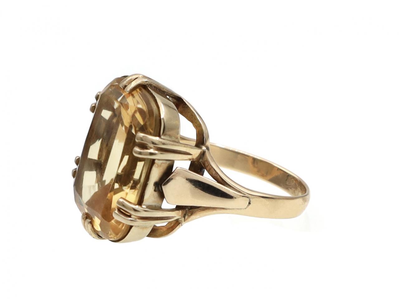 1970s large citrine dress ring in yellow gold. Set with a cushion shape mixed cut citrine in a split claw setting with intricate structured collet and raised decorative shoulders which smooth to a solid shank. Testing as 9kt gold.