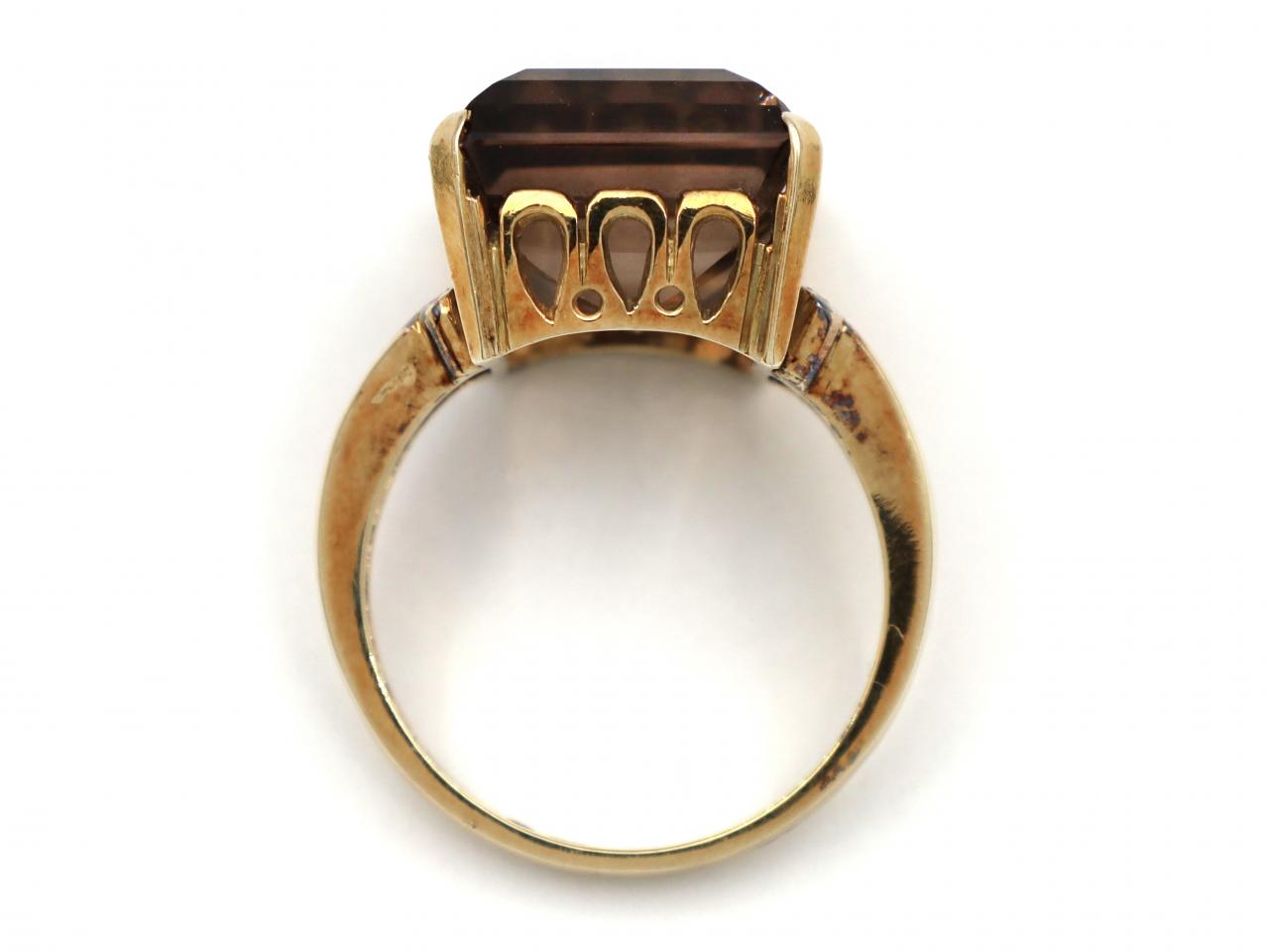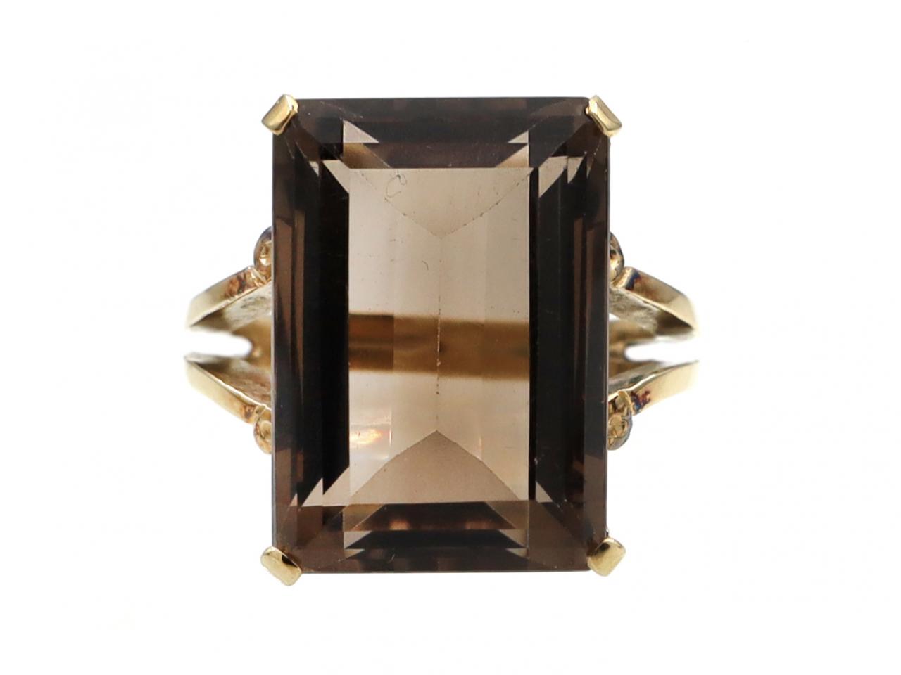1970s smokey quartz dress ring in 14kt yellow gold. Centred with a 23.00ct rectangular step cut smokey quartz in a raised four claw setting with an openwork gallery and split trumpeting shoulders which join to solid shank. Marked 14kt gold.