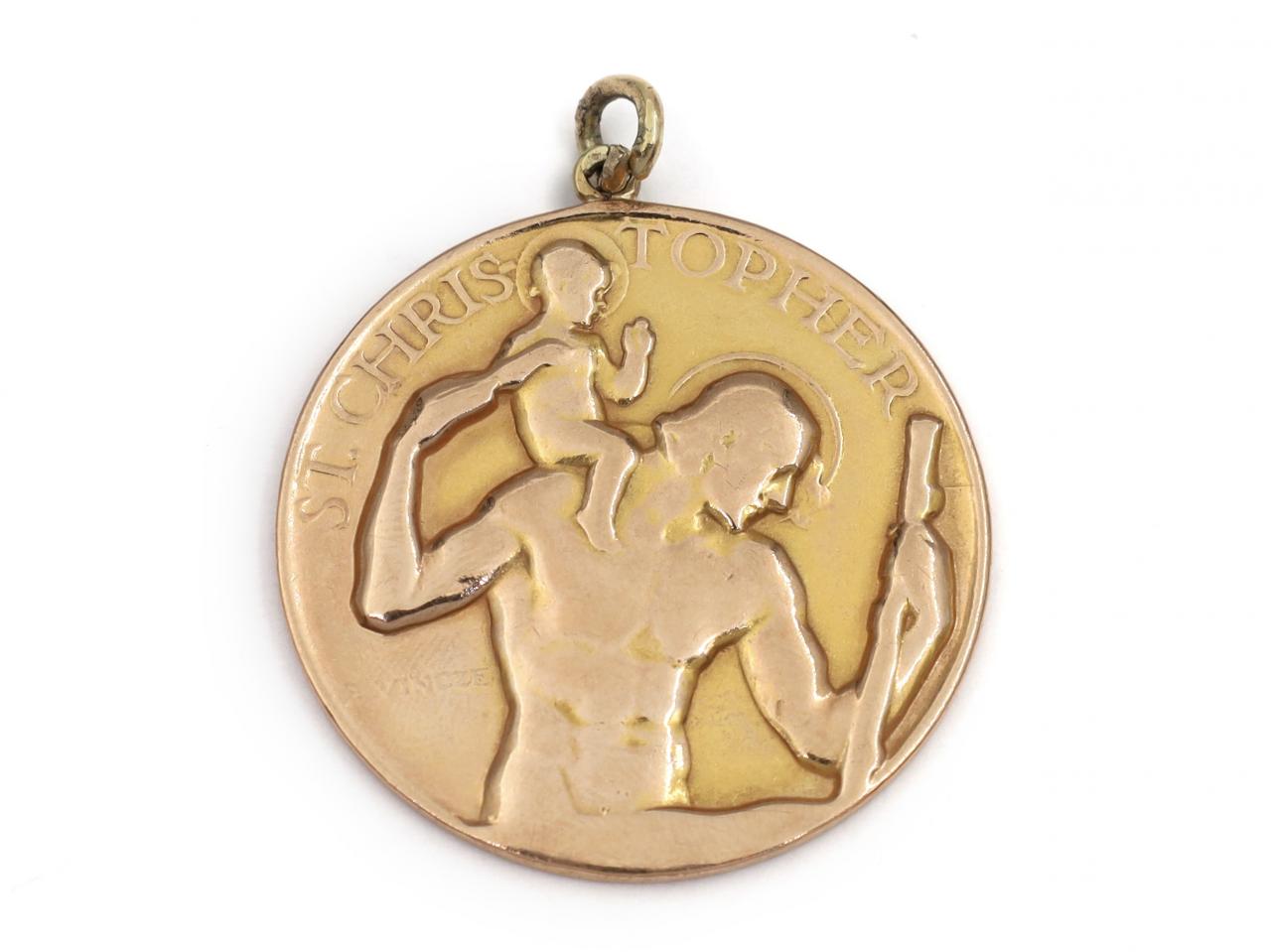 1970s St. Christopher medal in 9kt yellow gold by Paul Vincze. A circular pendant featuring a chaised figure of a bare chested man holding a holy child on his right shoulder and clasping a staff with his left hand, written to the top in serifed capital letters 'ST.CHRISTOPER', all suspended from a circular bale. Marker's Mark Paul Vincze. Hallmarked 9kt gold, London, 1973. Signed 'P.Vincze'.