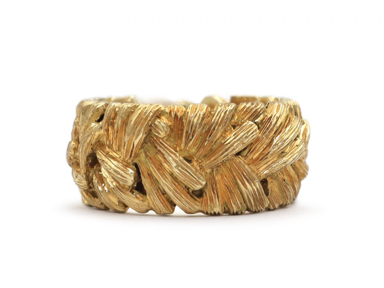 1970s textured feathered wide band ring in 18kt yellow gold. A wide cigar band ring featuring a textured finished around the full circumference of the ring created as an embellishment to a stylised feather motif seen in opposing directions throughout. Tested 18kt gold.