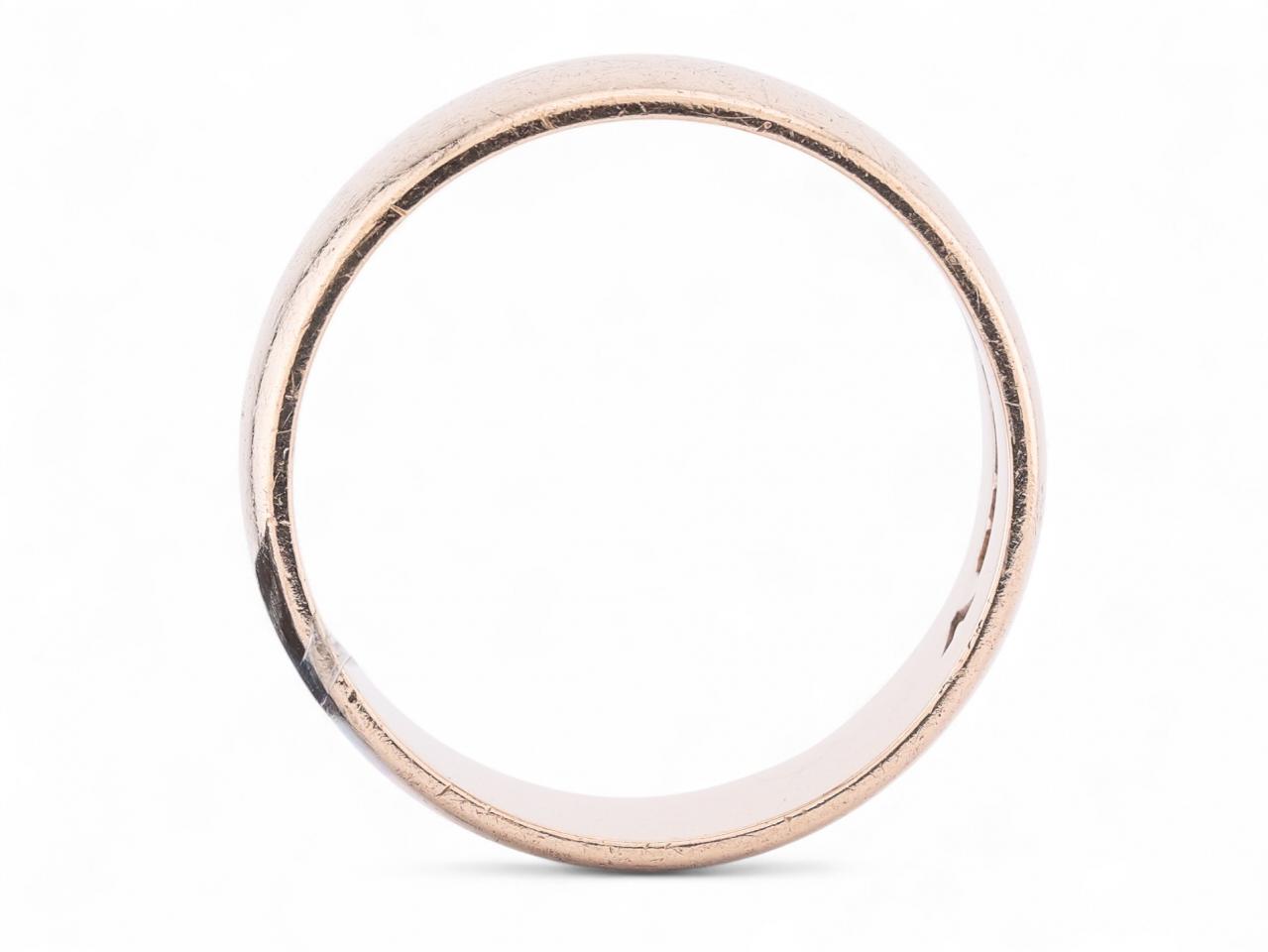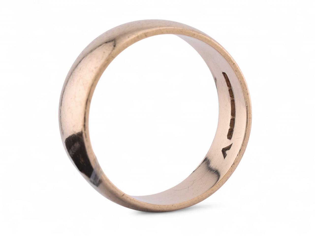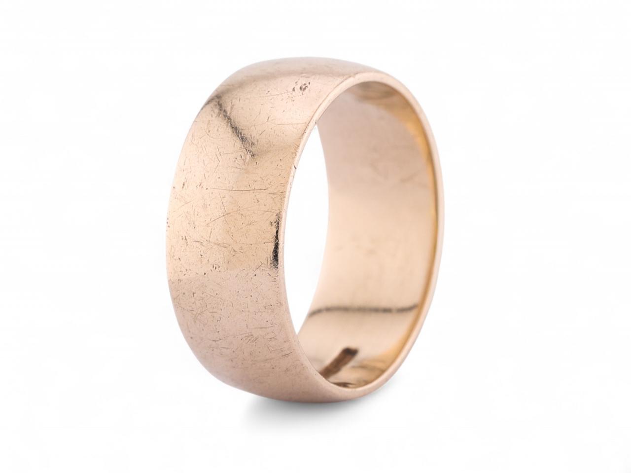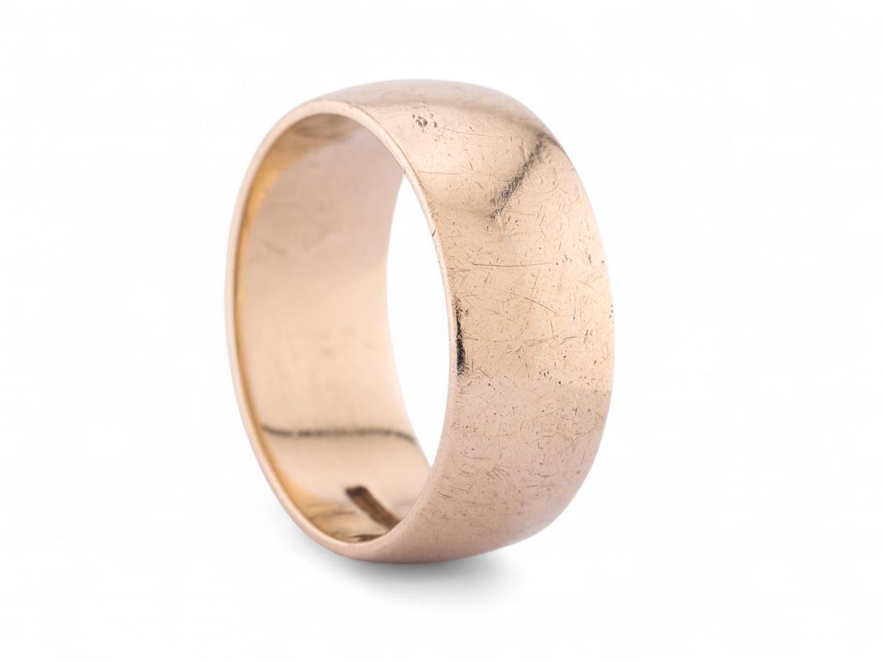 1970s wide wedding band in 9kt gold. A wide polished cigar band, approximately 9mm. Hallmarked 9kt, Birmingham, 1976.