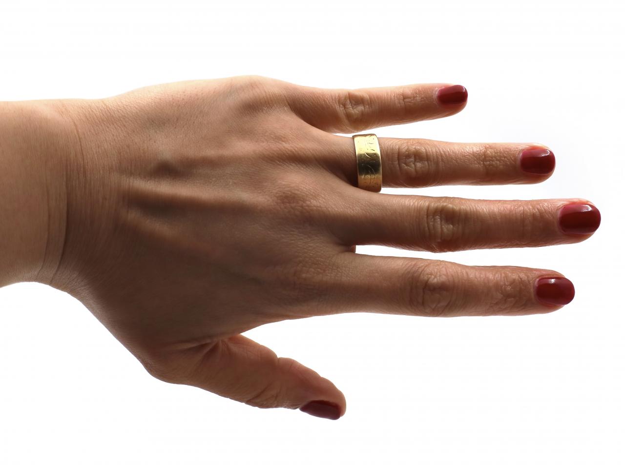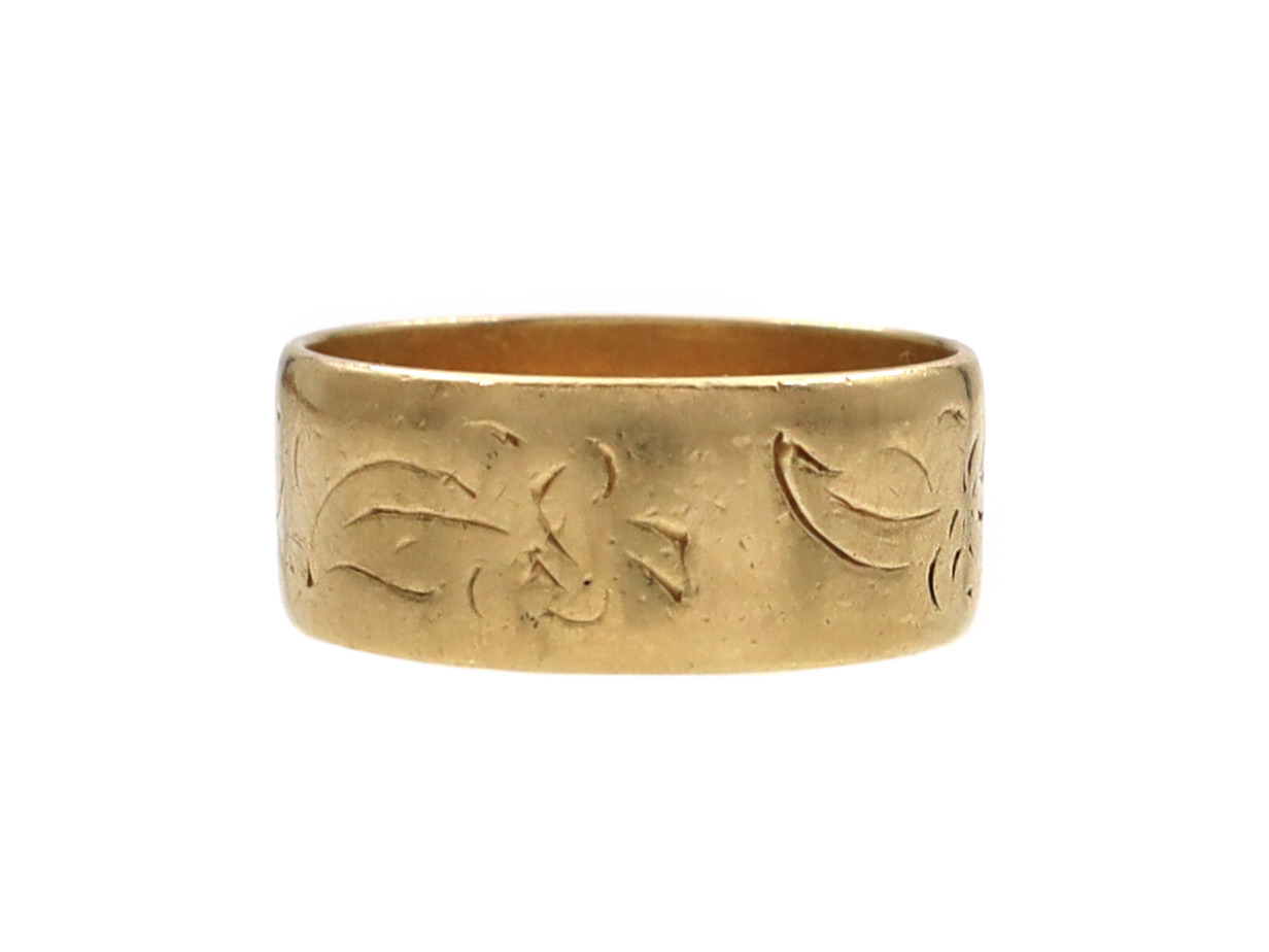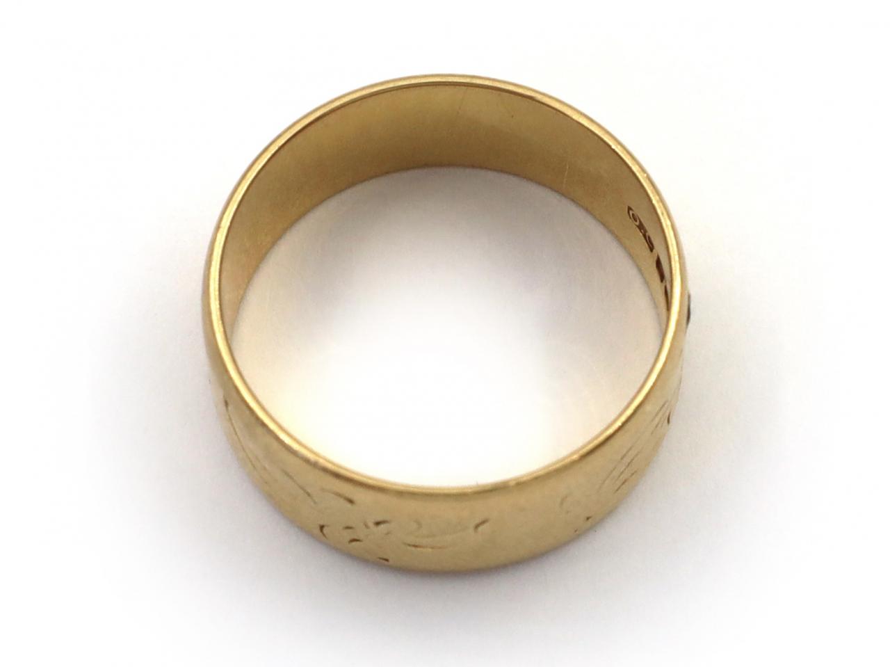 1972 etched wedding ring in 18kt yellow gold. A broad flat wedding band engraved to the outer with stylised ivy leaf motifs arounf the full circumference. Hallmarked 18kt gold, Dublin, 1972.