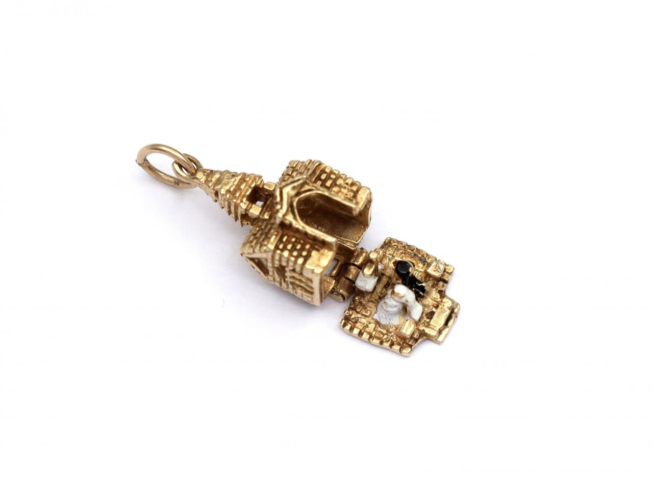 1974 church charm with a hidden bride and groom in 9kt yellow gold. Hallmarked 9kt gold, London, 1974.