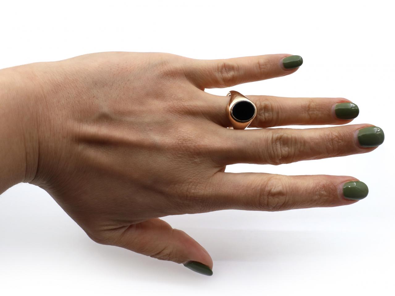 1974 oval onyx signet ring in 9kt yellow gold. Centred with an oval tablet in a rubover setting, to a classic signet ring with polished borders flanked to either side with trumpeting shoulders which taper to a solid shank. Hallmarked 9kt gold, Dublin, 1974.