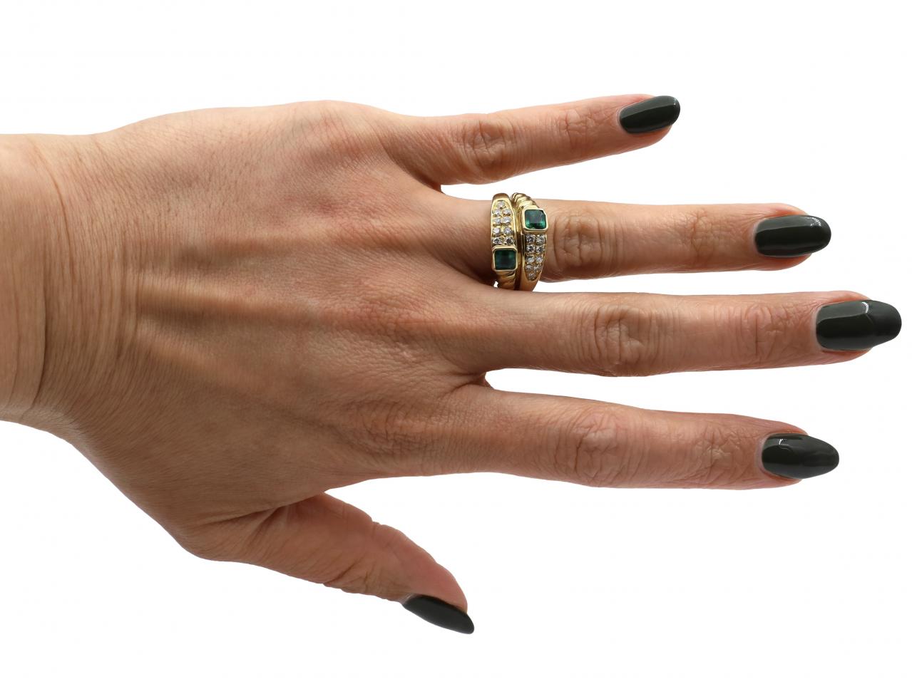 1980s chunky emerald and diamond two stone twist ring in 18kt yellow gold. Diagonally set with two octagonal emerald cut emeralds in rubover settings, further highlighted by eighteen round old cut diamonds in grain settings, to a chunky bypass ring with polished settings and gallery and met to either side with integrated shoulders featuring deeply ribbed decoration before smoothing to a broad shank. Marked 18kt gold.