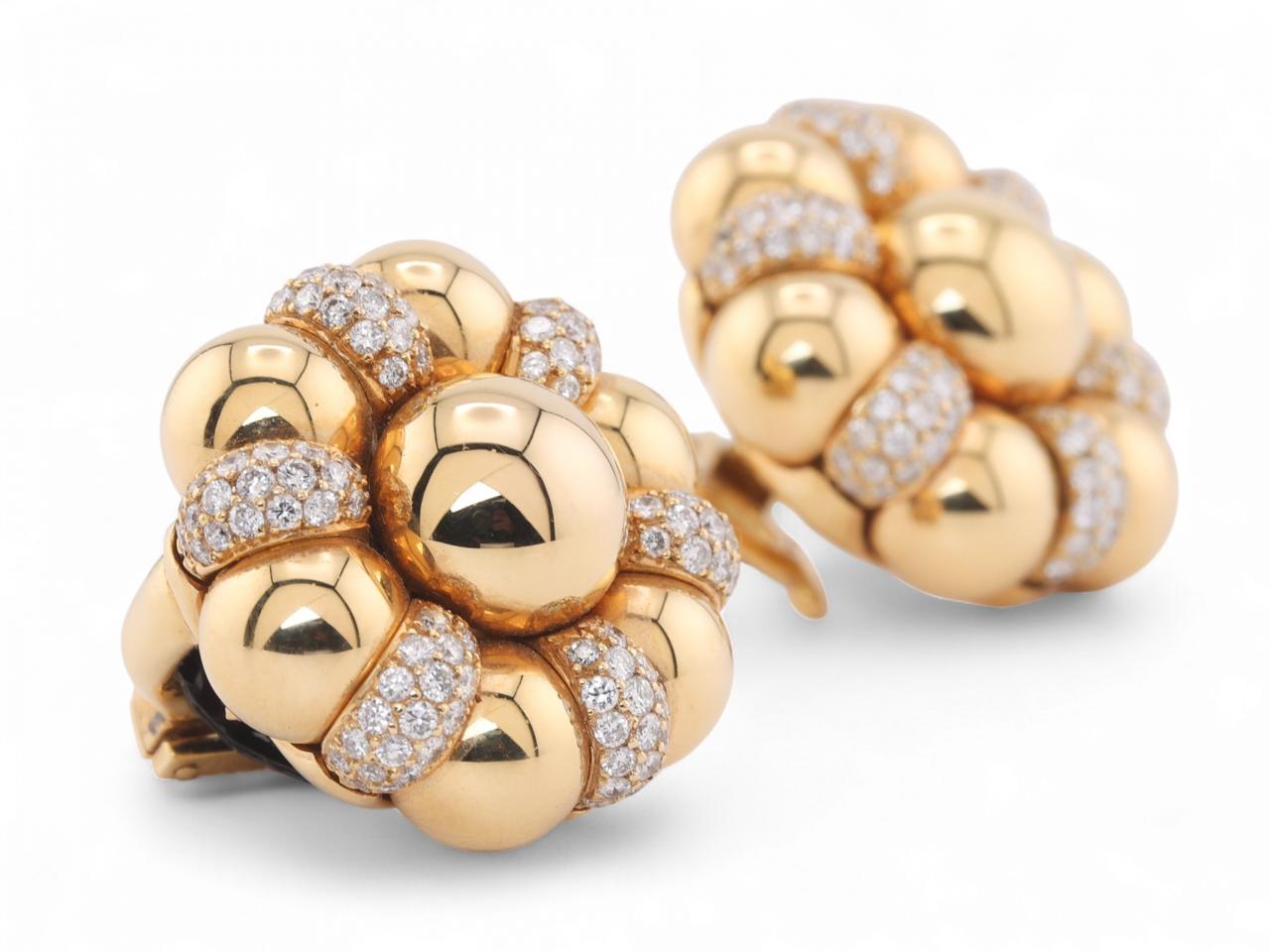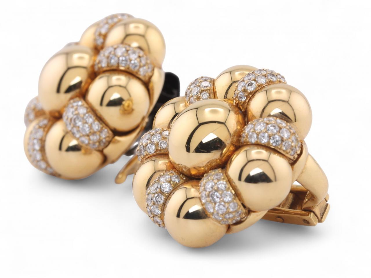 Pair of 1980s French diamond earrings in 18kt yellow gold, each designed as a bold bombe form with alternating pavé-set diamond and polished gold sections. Estimated total diamond weight 2.00 carats, G/H colour, VS clarity. Fitted with clip-on and post backs. Total weight 33 grams.