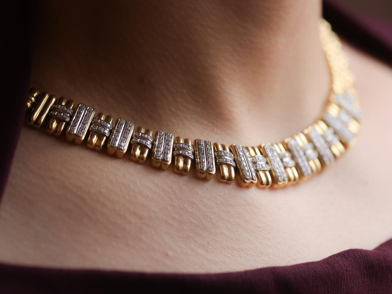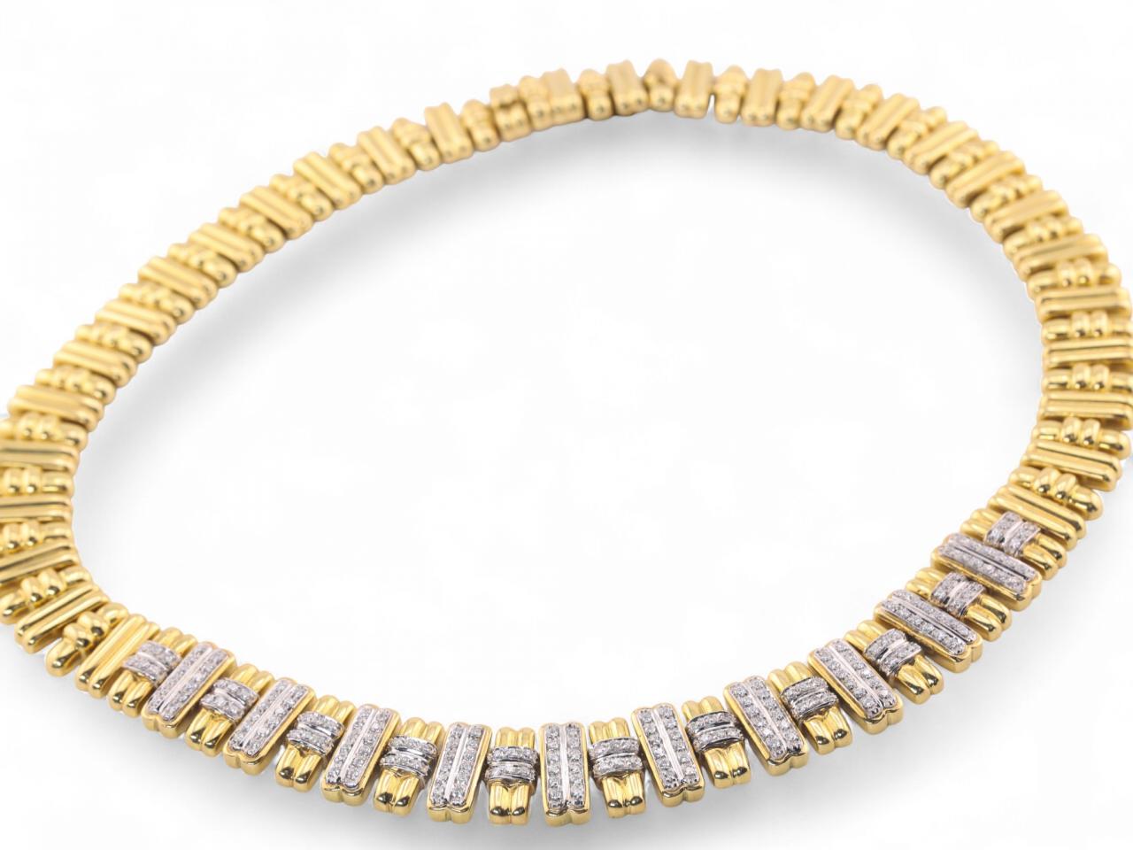 A substantial 1980s Italian diamond necklace crafted in 18kt yellow gold, featuring alternating polished and pavé-set diamond links. Estimated total diamond weight 10.00 carats of G/H colour, VS clarity. Beautifully articulated with a concealed clasp. Total weight 109 grams.