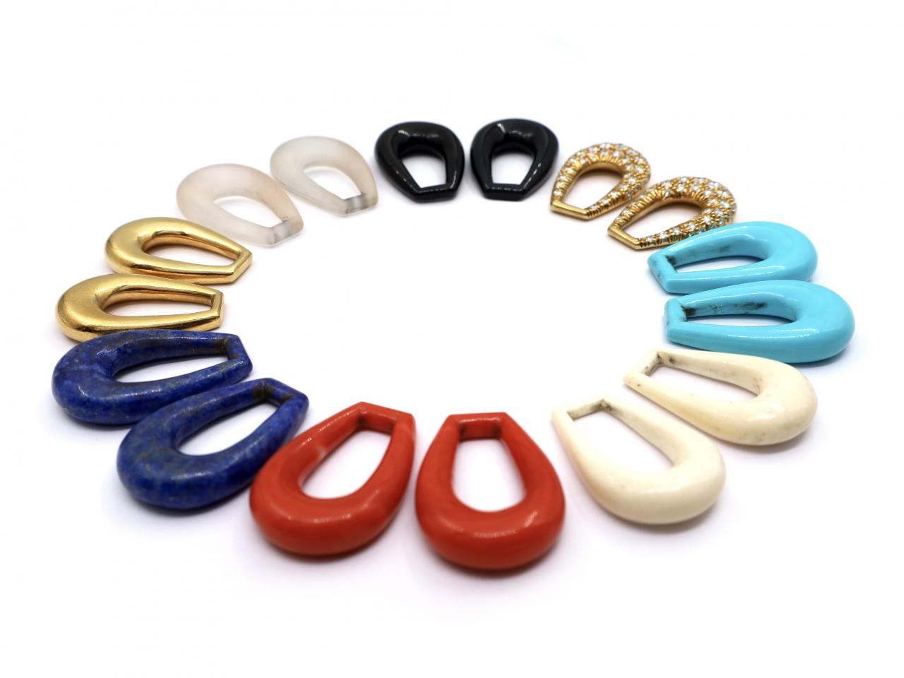 1980s set of interchangeable earrings in 18kt yellow gold. A pair of matching clip on earrings, each consisting of a linear dome studded with round brilliant cut diamonds in pave settings, fitted to the reverse with a hinged clip which opens to hold two additional earring drops and secured with an open hinged fitting, accompanied by eight pairs openwork carved hoops in onyx, 18kt yellow gold and diamond, turquoise, bone, coral, lapis lazuli, polished 18kt yellow gold and frosted rock crystal, all housed in a fitted retro box.