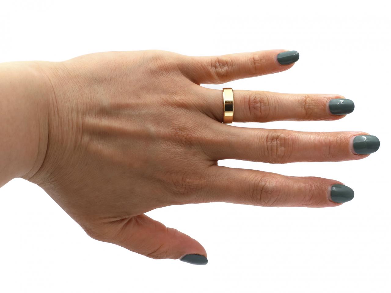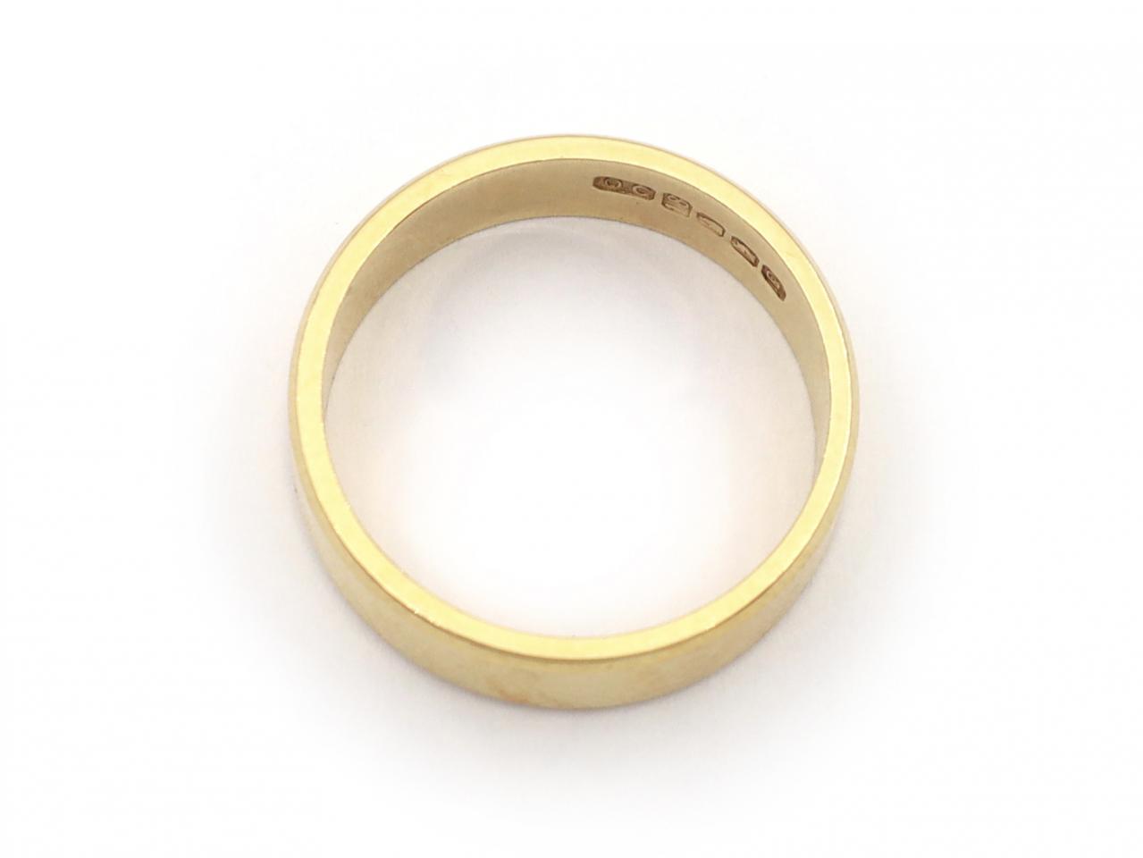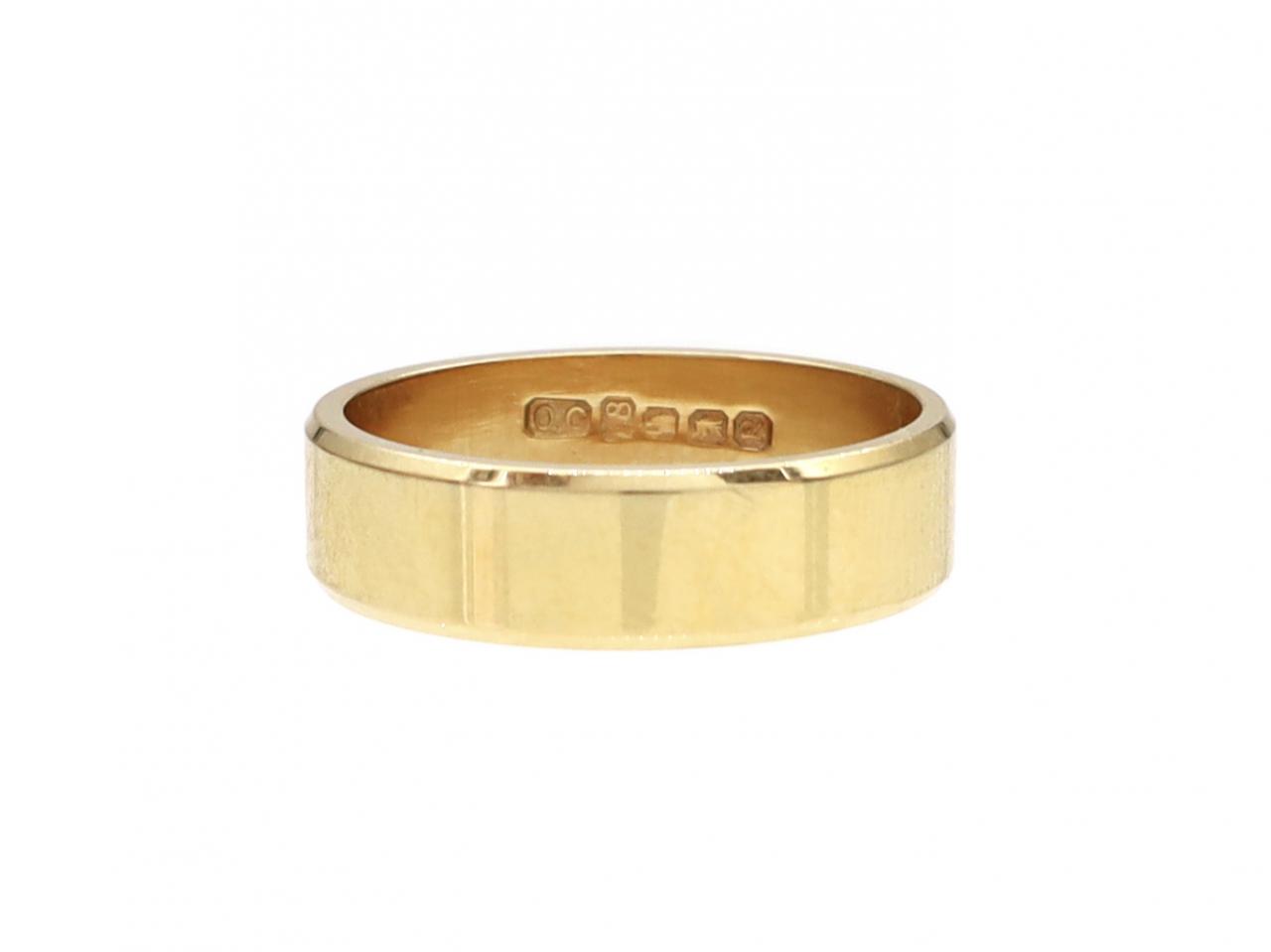 1982 polished flat 5mm wedding ring in 18kt yellow gold. Hallmarked 18kt gold, Dublin, 1982.