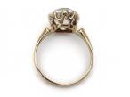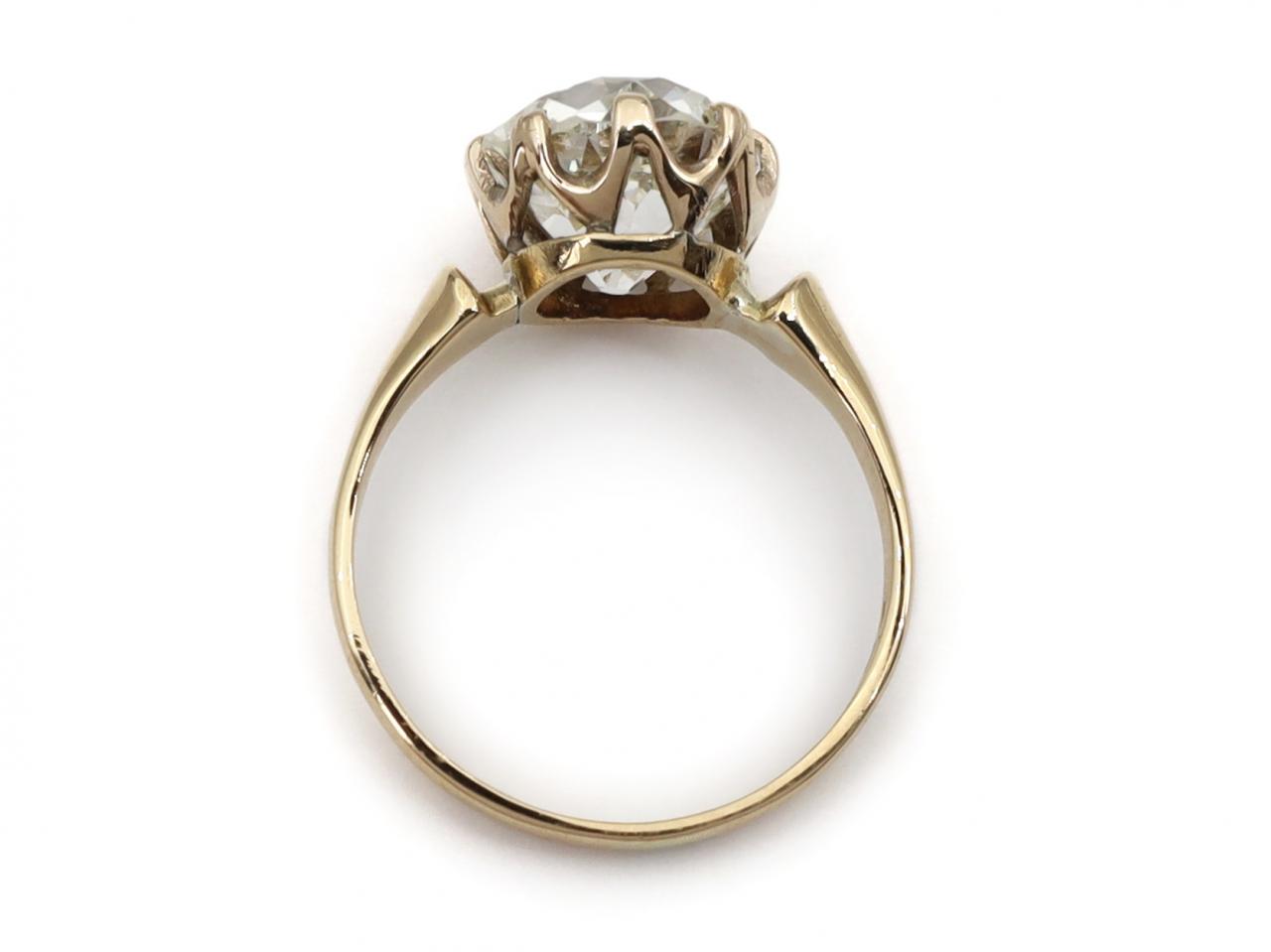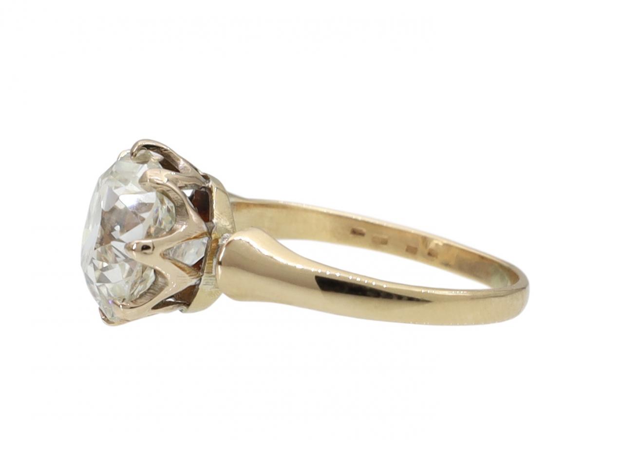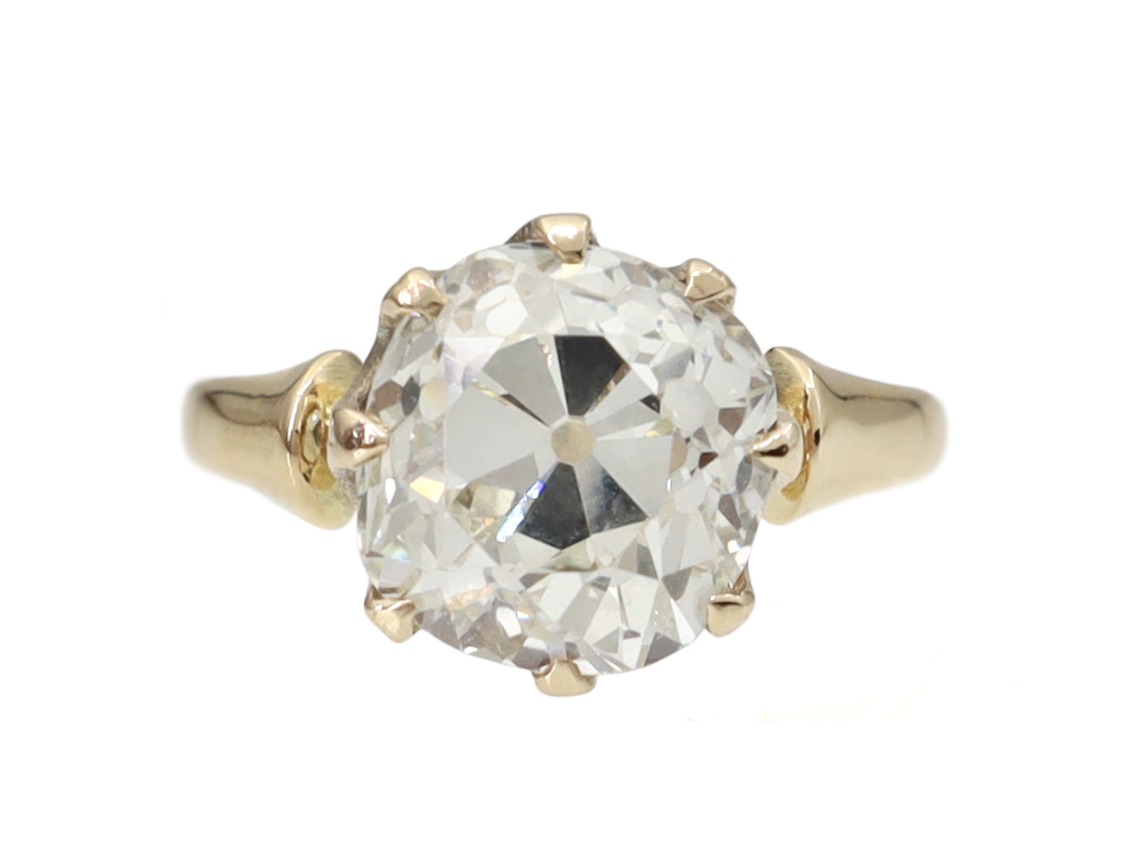Victorian 3.80ct cushion cut diamond solitaire engagement ring in 18kt gold. Set with an estimated 3.80ct cushion shape Old Mine cut diamond, J colour, VS2 clarity in an eight claw setting. The diamond sits in an openwork decorative collet. The collet is met to either side with recessed trumpeting shoulders that continue down to a solid shank. Circa 1890. Marked 18kt gold. Accompanied by a HRD Antwerp certificate.