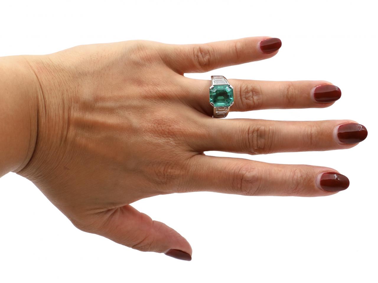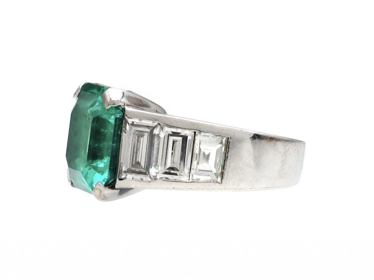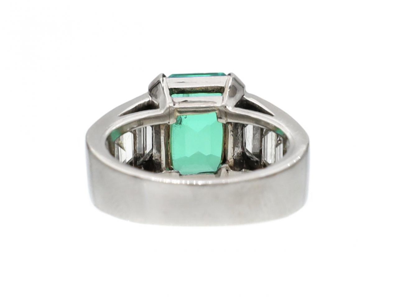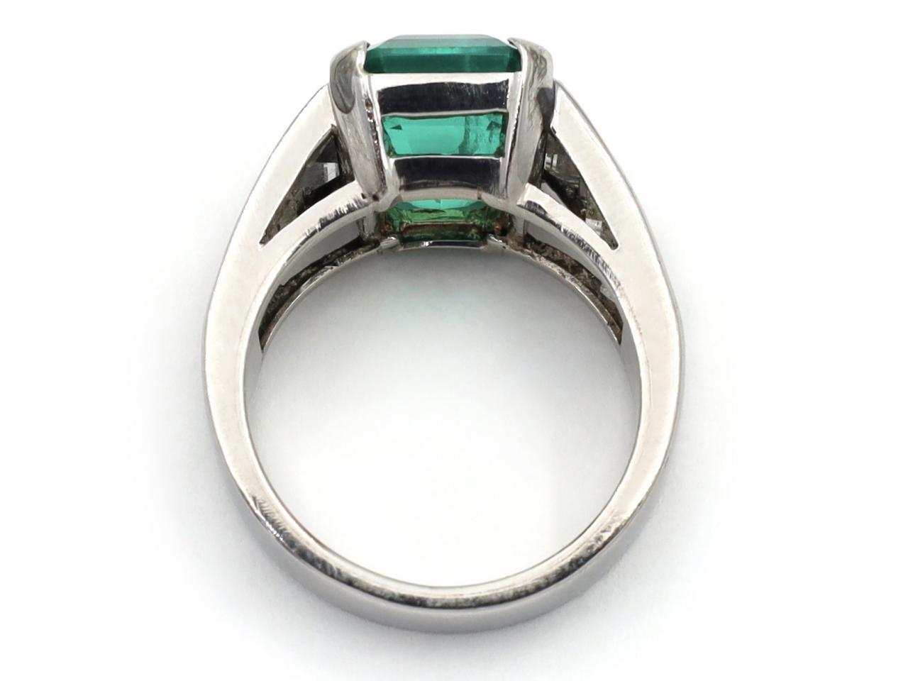 4.60ct Colombian emerald and diamond solitaire in platinum. Centrally set with an estimated 4.60ct octagonal emerald-cut Colombian emerald with insignificant indications of clarity enhancement in a slightly raised four claw setting, flanked to either side with six rectangular step cut diamonds in rubover settings, to a solitaire design with stylised claws, structured openwork gallery and raised trumpeting shoulders with polished edges and terminating to a broad solid shank. Estimated total diamond weight 1.60cts. Accompanied by Gemmological Certification Services certificate no.5783-444.