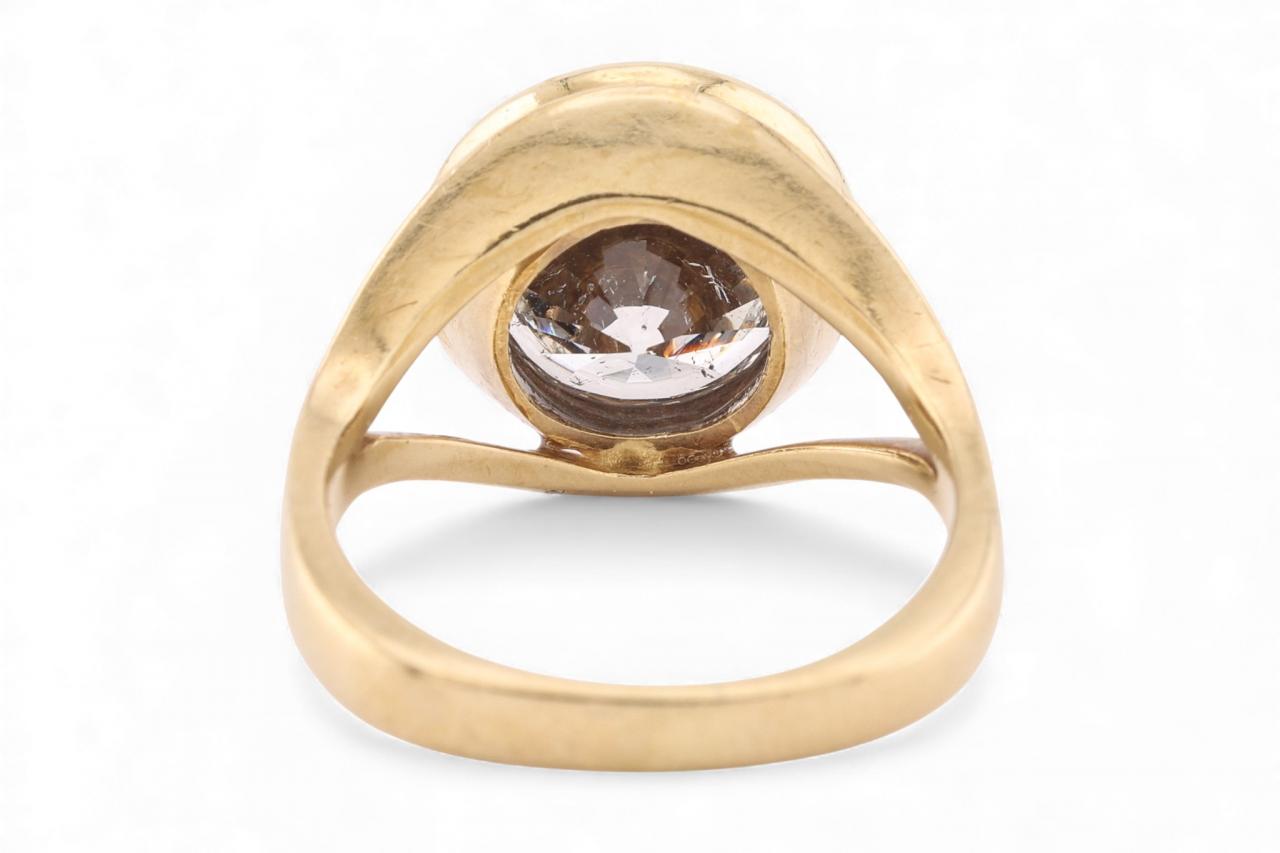 A substantial diamond ring in 18k yellow gold set with an estimated 5ct round brilliant diamond. The stone is bezel set in a split-shoulder mount that frames the diamond and gives the ring a strong sculptural profile. The diamond is estimated at I1 clarity with visible internal features typical of larger stones. Colour appears in the H to I range. The bold gold setting gives the piece a clean modern look and keeps attention on the size of the diamond.