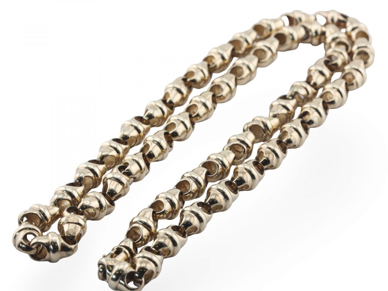 A substantial 9ct yellow gold chain necklace in a decorative fancy link pattern. Each link comprises a smooth, polished barrel shape flanked by grooved collars, creating a rhythmic, sculptural effect along the entire length. The warm yellow gold has a rich lustre that catches the light beautifully.