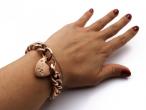 9kt rose gold antique engraved and polished curb bracelet with heart lock. Consisting of a hollow curb bracelet alternating with polished and engraved links, connecting to a detachable polished heart lock further secured by a safety chain. Hallmarked 9kt gold.