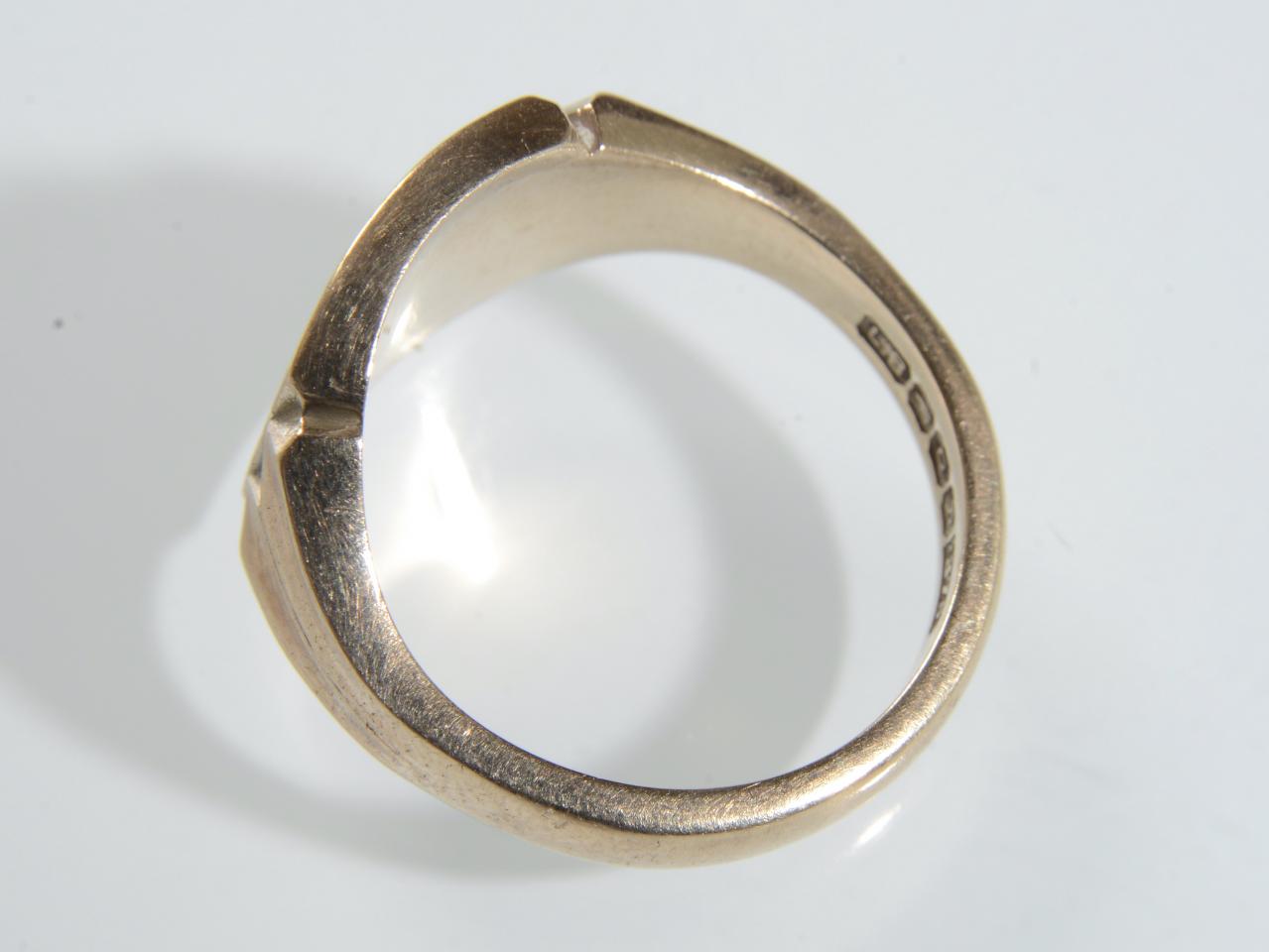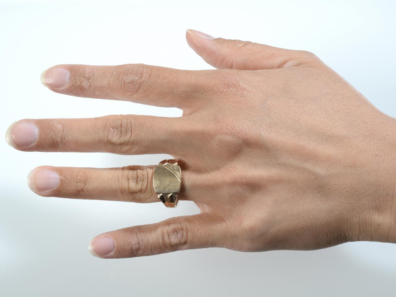9kt yellow gold rounded square signet ring, centred with a curved square plaque decorated to the bottom right-hand corner with stylised motifs, flanked by trumpeting shoulders with indented chevron details which taper to a solid shank. Marked 9kt gold.