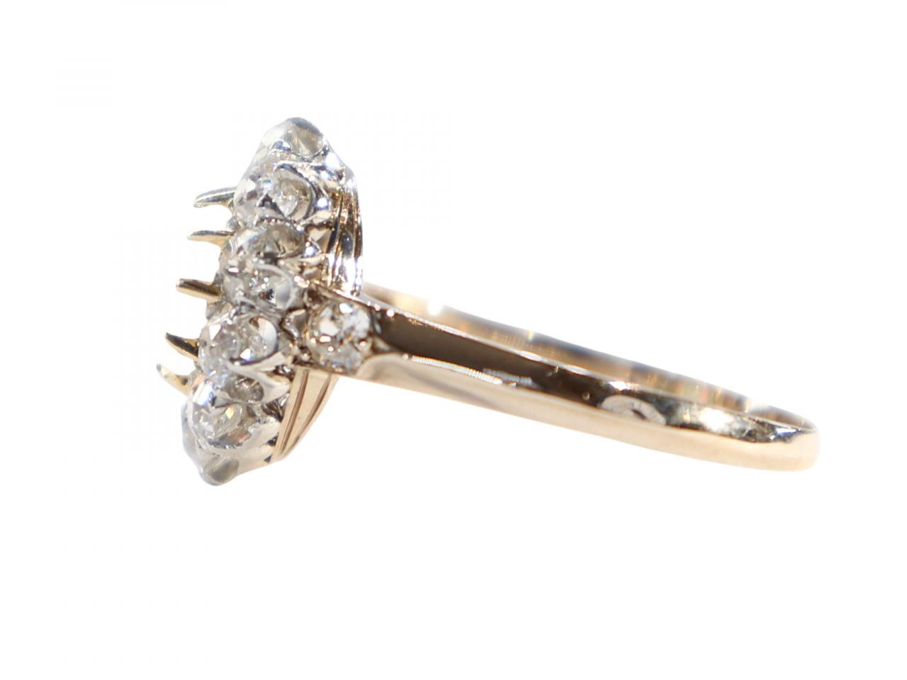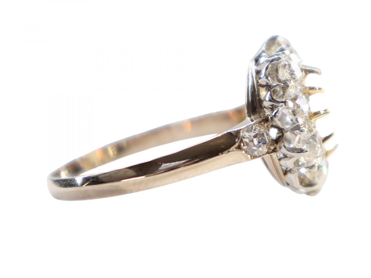 The cluster is set a yellow gold shank, with further old cut diamonds set into the shoulders adding extra sparkle. The open gallery construction allows light to enter the stones from below and is typical of quality Victorian workmanship. This design, sometimes called a daisy cluster, was one of the most popular ring styles of the Victorian era.