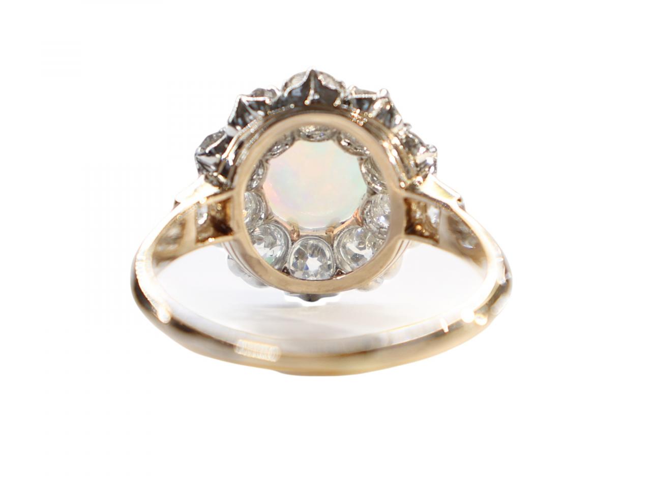 A Victorian cluster ring featuring a cabochon opal surrounded by a halo of old cut diamonds. The opal displays attractive play of colour with flashes of green, pink and peach moving across the stone as it catches the light. The surrounding diamonds are substantial old cuts with that characteristic soft, romantic sparkle that distinguishes antique diamonds from their modern counterparts.