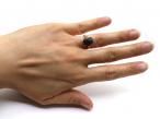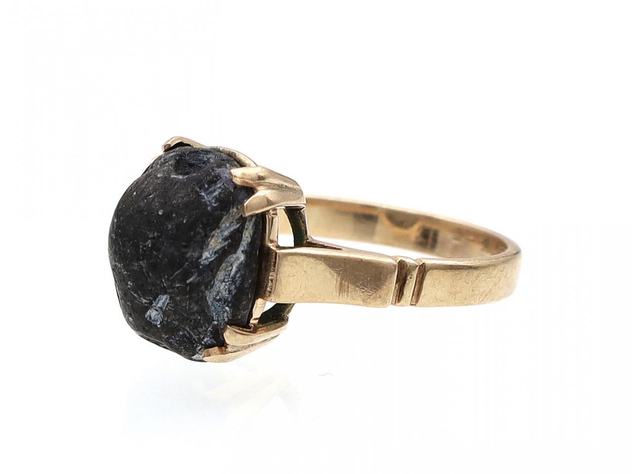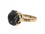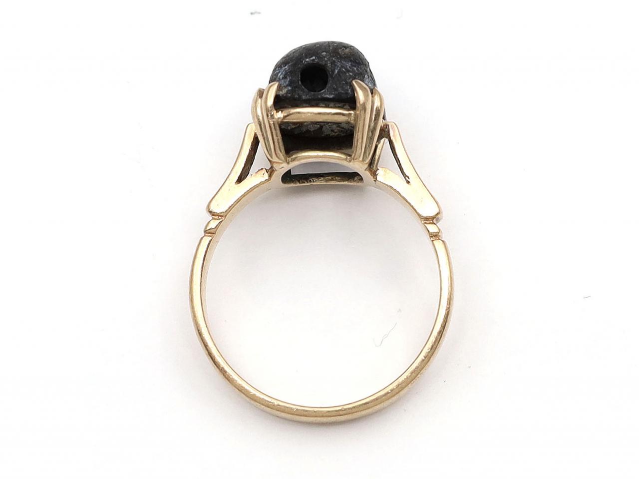 Ancient Egyptian black faience scarab Beatle in 9kt gold ring. Centred with a carved faience bead in the form of a scarab beatle, in a split claw setting, flanked to either side with raised trumpeting shoulders which terminate to a smooth shank. Marked 9kt gold.