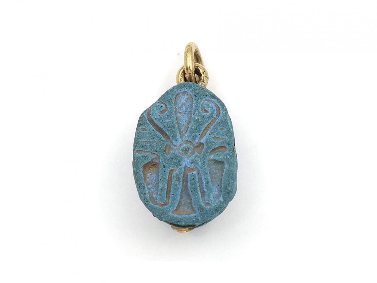 Ancient Egyptian blue faience scarab beetle pendant with yellow gold bale. The scarab beetle was a sacred and well used symbol in Ancient Egypt, representing the sun which resurrected every day. Scarab beetles were often used as an amulet and guide for the afterlife.