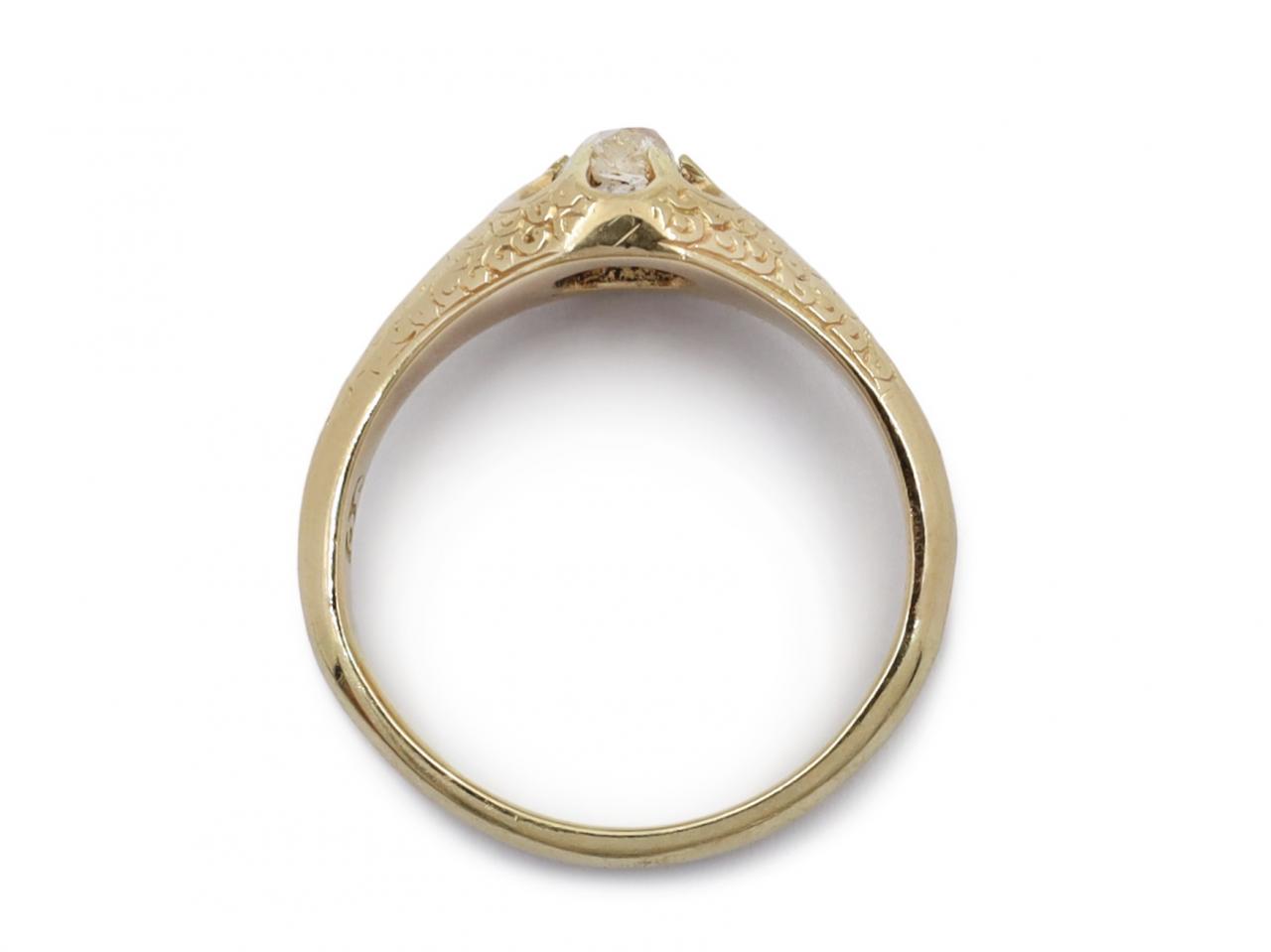 Antique 0.20ct Old Mine cut diamond solitaire ring in 18kt yellow gold. Centred with an estimated 0.20ct cushion shape Old Mine cut diamond in a recessed claw setting, to a solitaire design with curving claws, subtle engravings and integrated trumpeting shoulders (featuring light dints) which taper and smooth to a solid shank. Marked 18kt gold.